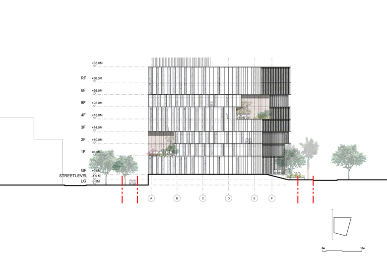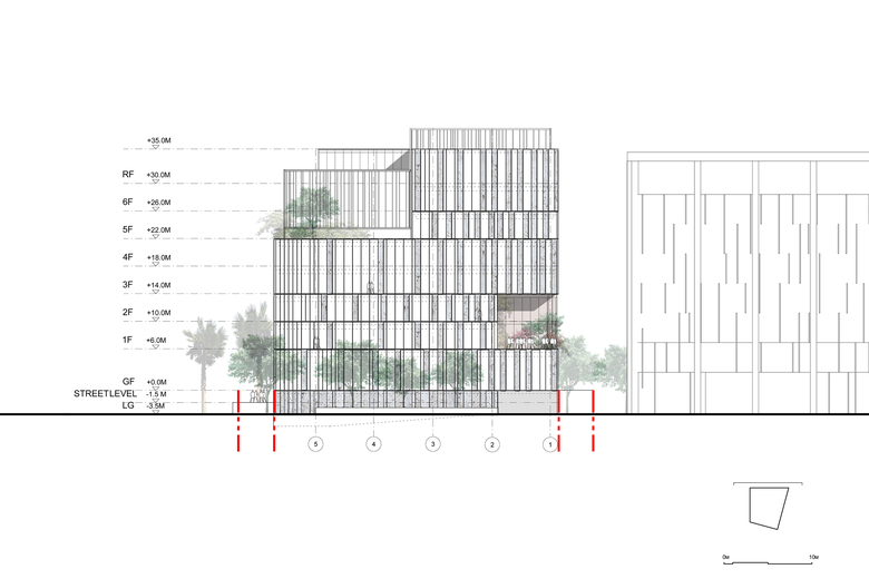 建筑入口位于东南角,具有可视性和标志性。东南侧的落客区连接大楼,并通过一系列景观平台及斜坡,通往大堂。大堂从上方建筑外立面后退,塑造带顶遮阳空间,方便人们从商业、餐饮设施及办公大堂进入。