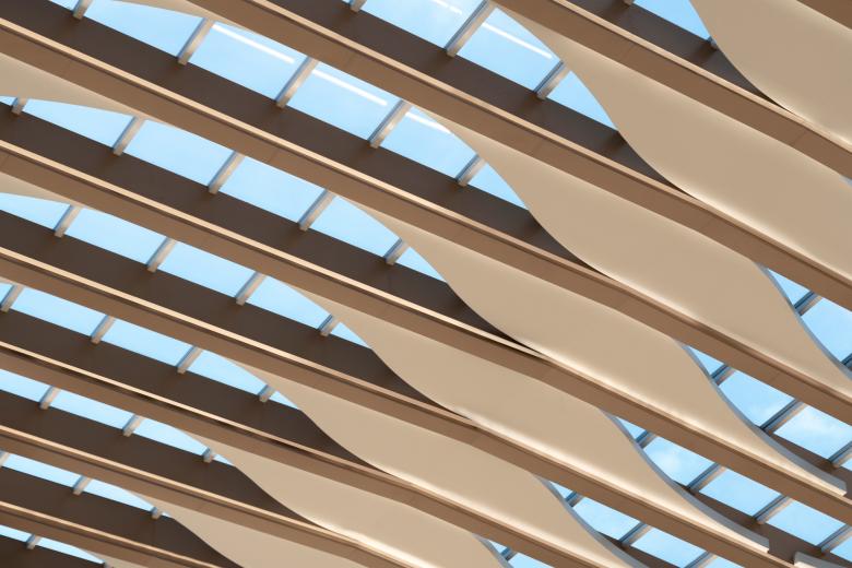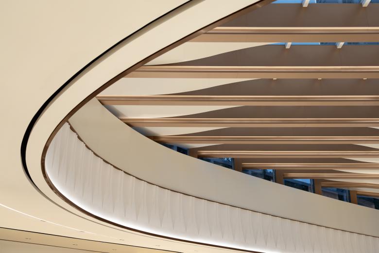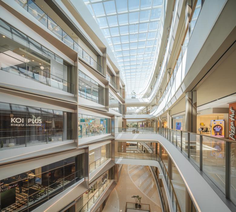The Cloud Atrium on Level 4 is created as a breakout space for shoppers, with a ceiling design that mimics when tea leaves float on water, eliciting a feeling of weightlessness. Light filled with large glass circular walls and an outside terrace. Mature trees on the interior of the public seatings, underscore the connection to nature and provide a sense of calm and relaxation.