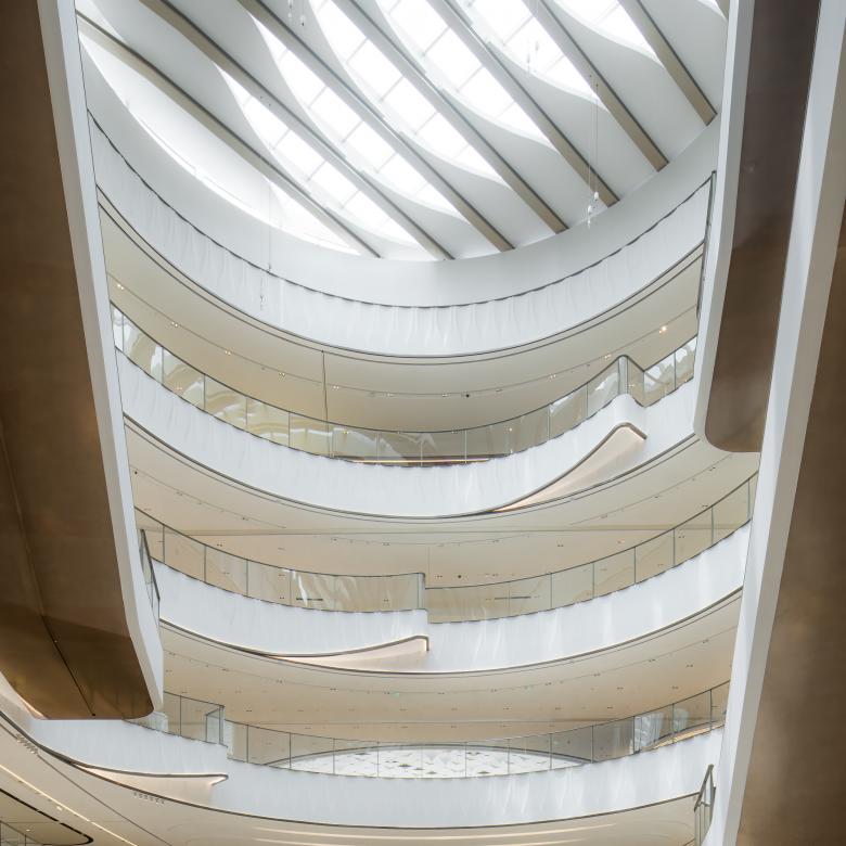 Encompassing two large wings with a centrally located lobby, the design features light, bright finishes alongside curved void edges, accented with modern recessed lighting. The wave-like shapes of the viewing balconies evoke the rolling hills of tea mountains and surrounding nature. The main atrium’s centrepiece is formed by two glass bridges that are illuminated, giving the appearance of a crystal.