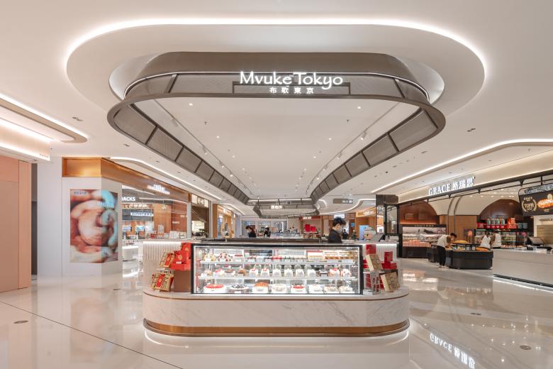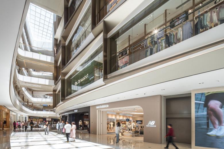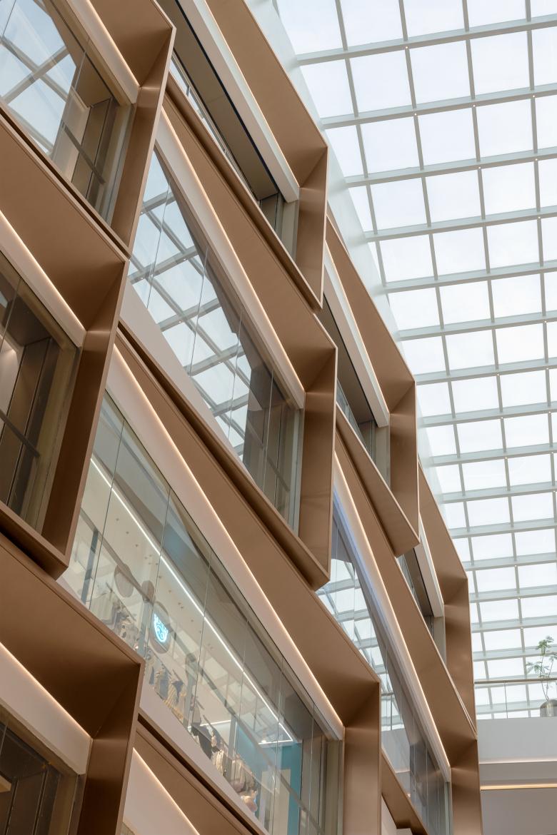 The South Atrium draws inspiration from Chinese metal tea boxes, framing sections of the space to curate a selection of goods and provide a unique semi-open setting for F&B tenants. The East Atrium features a series of themed ceiling patterns to create diverse visual experiences for each floor.