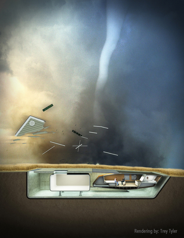 陷入地下的建筑屋顶由一层不透水的密封设计锁住,为整个结构防风防水。自上世纪90年代中期,就有一系列使住宅显示为漂浮状以远离灾害的研究,但这种上浮的方式未有预见水的流速,以及水中所含碎片造成的剪磨削力所带来的破坏力,因此最安全的地方还是在地下。