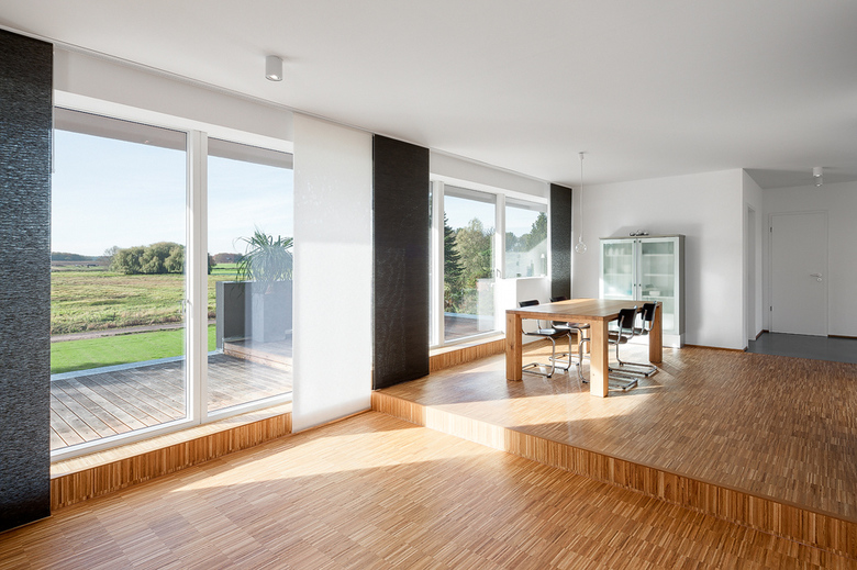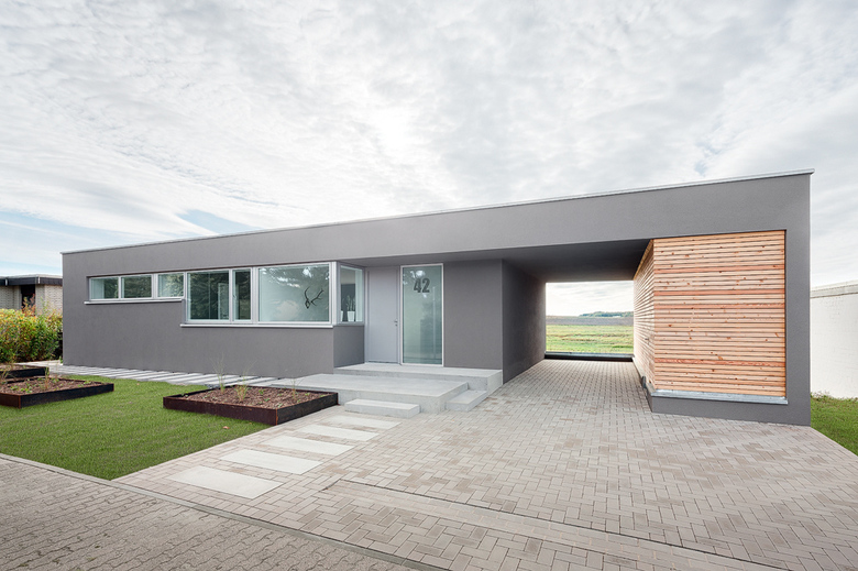 Das durch Teilung entstandene Grundstück bietet Platz für ein kleines Haus am Hang. Der Neubau fügt sich ein in die Zeile der vorhandenen eingeschossigen Bebauung, die den Rand des Ortes Heiligendorf einfasst. Der traditionelle Wohngrundriss ist hier auf den Kopf gestellt: das oberste Geschoss mit Eingang, Wohn- und Essräumen öffnet sich mit Weitblick von der großen Terrasse oberhalb des Gartens. Die Schlafräume und Kinderzimmer befinden sich im Geschoss darunter. So entsteht eine Spielloggia mit einem ebenerdigen Zugang in den Garten. Auch der überdachte PKW Stellplatz genießt den Ausblick in die Auenlandschaft.