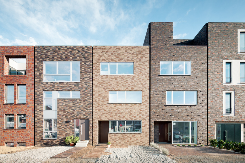 Das Volumen der Häuser gliedert sich, um private Terrassen und Dachgärten zu bilden. Der Garten wird gemeinsam als Spiel- und Freizeitfläche genutzt.