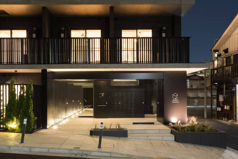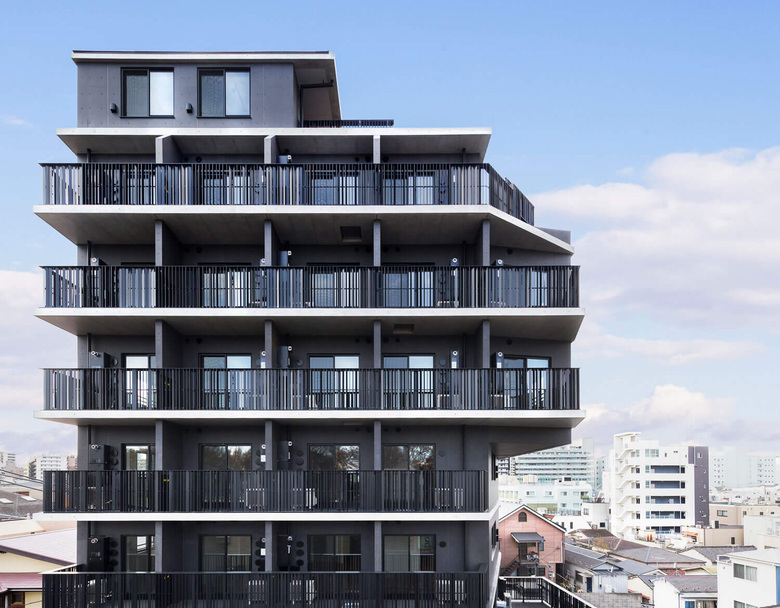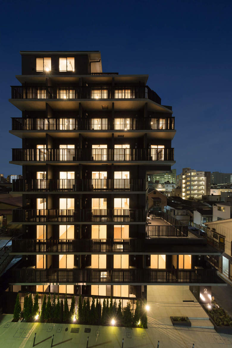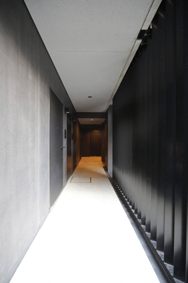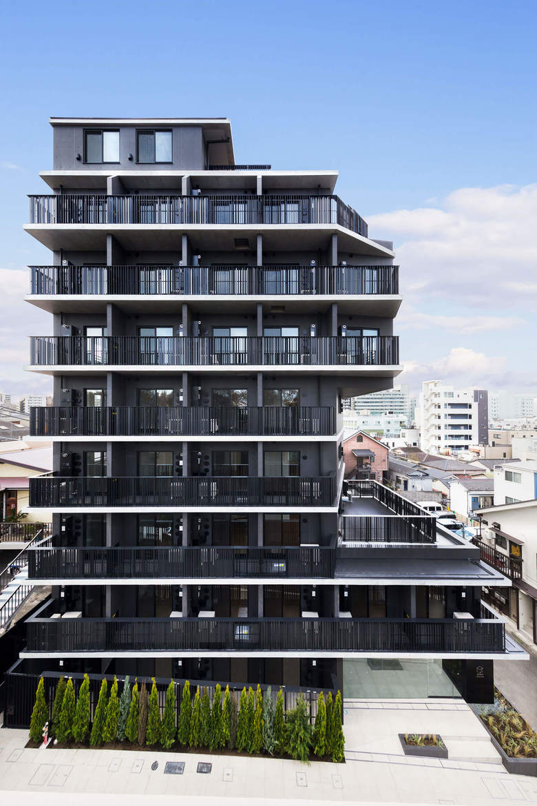 戸越銀座の商店街から少し坂を登った近隣商業と第1種住居地域をまたぐ敷地に建つ投資用の9階建ての集合住宅。元々は6階建ての女子学生寮が建っていた500㎡の敷地から最大限有効な面積を得るスタディをすると、住居地域部分の低層棟と、近隣商業部分の高層棟に分かれ、高層棟は日影計算のため、3階から5階がくびれた形状となった。