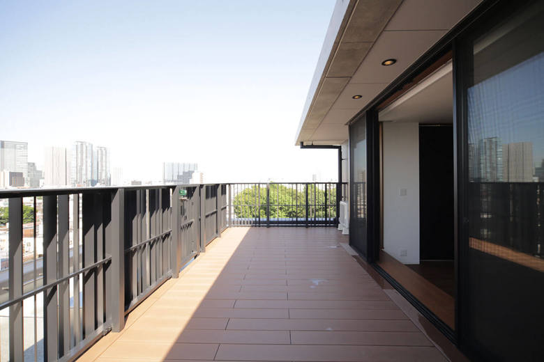 集合住宅のバルコニーには光や景色を取り入れるための開放性と同時にプライバシーも必要だ。美観のためには空調の室外機をあまり見せない工夫も考えた。このプロジェクトでは手すりの縦格子の角度を変えたフラットバーで作ることで、開く場所を閉じる場所をコントロールできるようにしている。低層階は前を通る人の視線を遮るために閉じ気味にして、あまり視線が気にならない上層階はなるべく開くようにした。また室外機などの機器がある部分は閉じているが、開いた部分と閉じた部分がシームレスに連続することで、表情のあるファサードを形成している。