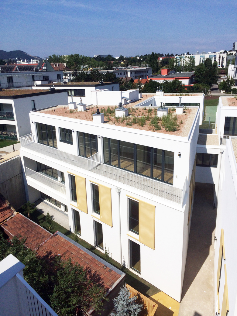 Alle Dachaufbauten und Bodenaufbauten der Innenhöfe in der Wohnanlage wurden als Wasserspeicherdächer (Retensionsdächer) ausgeführt und mit geeigneten Pflanzen begrünt. Dadurch wird ein Anteil des Niederschlagswassers gespeichert und durch die verlangsamte Verdunstung der begrünte Boden genährt und das Mikroklima verbessert.