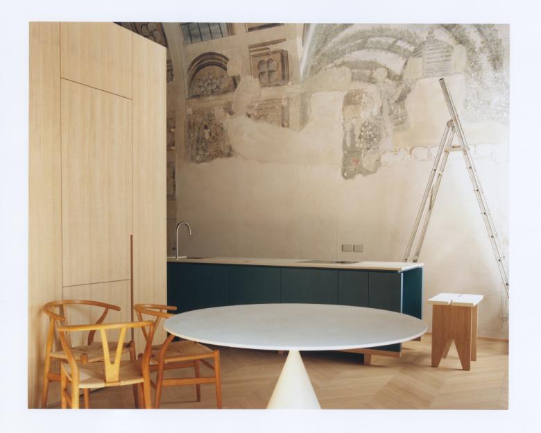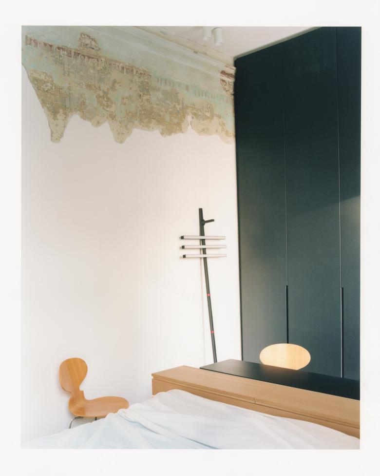 Il volume centrale della zona giorno contiene il bagno di servizio, che consente di lasciare libere le pareti perimetrali ed allo stesso tempo gerarchizzare la funzione degli spazi domestici.