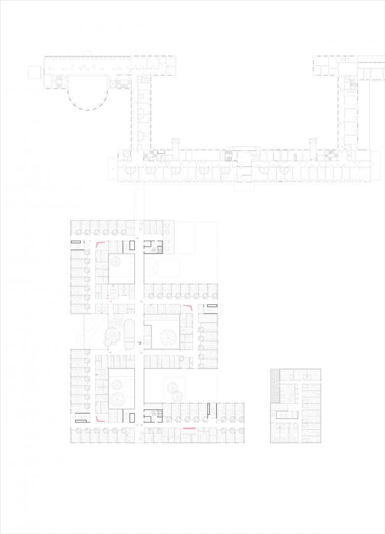 Die Typologie lehnt sich an die historische Entwicklung an, über der kompakten Eingangsebene beginnt im Hauptgeschoss die terrassierte mäanderförmige Ausgestaltung der Baukörper, die Rücksicht auf die angrenzenden Gebäude nimmt. Die zentrale zweigeschossige Eingangshalle mit der künstlerisch gestalteten Lichtdecke empfängt Patient*innen und Besucher*innen von Beginn an mit einer offenen und hellen Atmosphäre. In Kombination mit vielfältigen Blickbeziehungen liefert sie intuitive Orientierbarkeit.