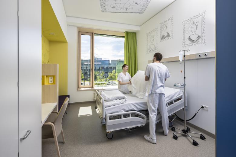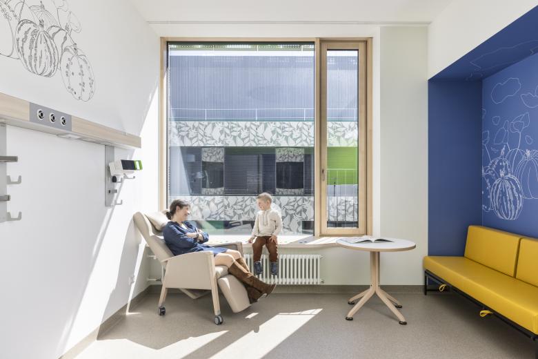 Die Gestaltung der Patient*innenzimmer orientiert sich an den speziellen Anforderungen des*der Eltern-Kind‐Patient*in und bietet durch klares Zonieren Raum für Geborgenheit und Zuwendung. Die Position des Bettes schenkt Intimität und Ruhe, der Sitzplatz in Fensternähe Raum für Aufenthalt und Kommunikation. Alle Zimmer bieten Angehörigen die Möglichkeit zu übernachten, das Rooming-In unterstützt die Behandlung und den Heilungsprozess. Die Zimmertüren sind räumlich versetzt, sodass ein kleiner Pufferraum zu den Stationsfluren entsteht, und jedes Zimmer eine eigene Adresse erhält.