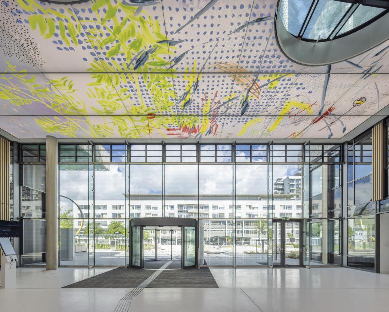 Die vielfältigen Faktoren der Healing Architecture greifen in multiplen Schichten behutsam ineinander und schaffen eine heilsame Umgebung, die während Erkrankung und Klinikaufenthalt für Kinder, Jugendliche und Angehörige, aber auch für das Personal, stressreduzierend bzw. genesungsfördernd wirksam ist – und das allgemeine Wohlbefinden aller Menschen vor Ort fördert. Die ganze Klinik ist durchdrungen von Healing Art, die achtsam in die Architektur integriert umgesetzt wurde. Kunstwerke wie die große helle Lichtdecke der Eingangshalle mit der Kunst von Paul Schwer, oder die über die Klinik verteilten Grafiken von Jack Broeders, wurden von den Architekt*innen intensiv begleitet.