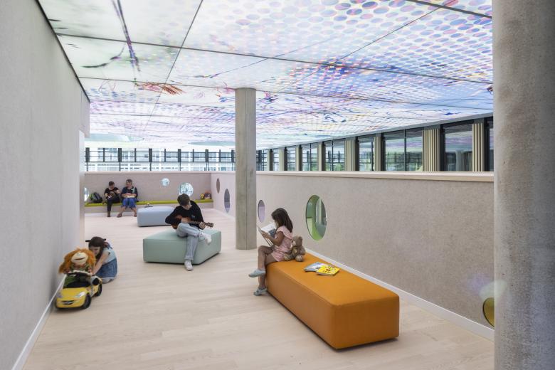 Das Projekt ist einfühlsam und gut durchdacht geplant. Es setzt Patient*innen an erste Stelle, stellt viele Bezüge zwischen Innenraum und der umliegenden Parklandschaft her, und wurde nach den DGNB Gold Nachhaltigkeitsstandards konzipiert. Der gesamte Komplex ist von einem modernen und farbenfrohen Dorfcharakter geprägt. Die Terrassen der Pflegegeschosse und die begrünten Dächer setzen den umliegenden Park in der Klinik fort und bieten weitere Erholungs- und Interaktionsräume. Kinder und Eltern können jederzeit leicht an die frische Luft gelangen – in Höfen, auf Terrassen und Balkonen.