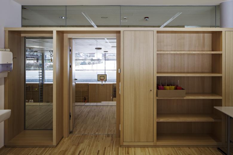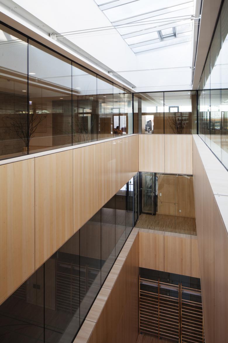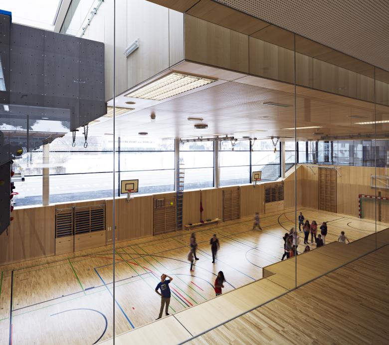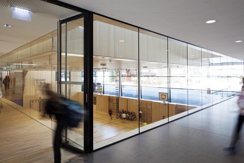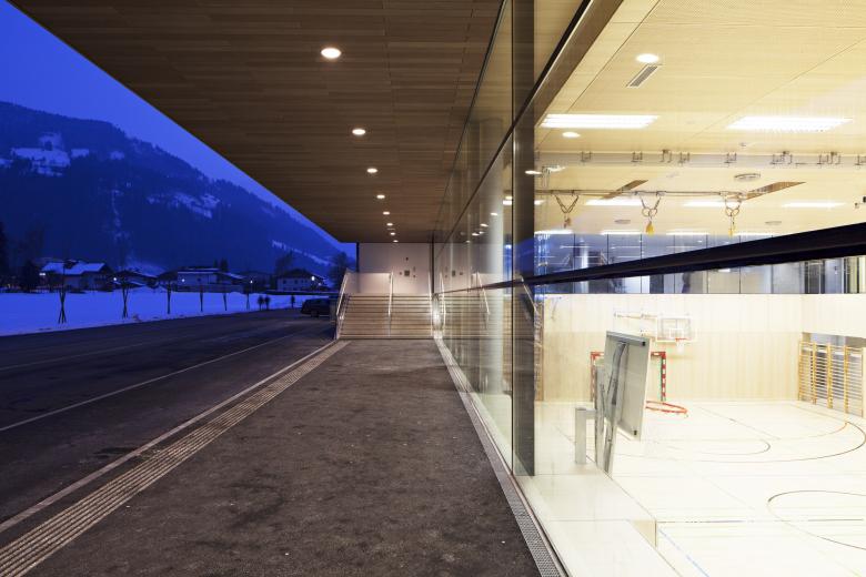 Die reduzierte, aber raffinierte Formensprache lässt das Gebäude von innen nach außen und umgekehrt fließen. Das Foyer heißt BesucherInnen und SchülerInnen willkommen. Ein speziell abgesenkter Turnsaal, eine Panorama-Terrasse, ein Pausenhof in Form eines begehbaren Daches und einige architektonische Überraschungen machen den Besuch des Zentrums zum alltäglichen Erlebnis. Beton, viele Glasflächen und warme Holztöne schaffen dafür einen passenden und nachhaltigen Rahmen.