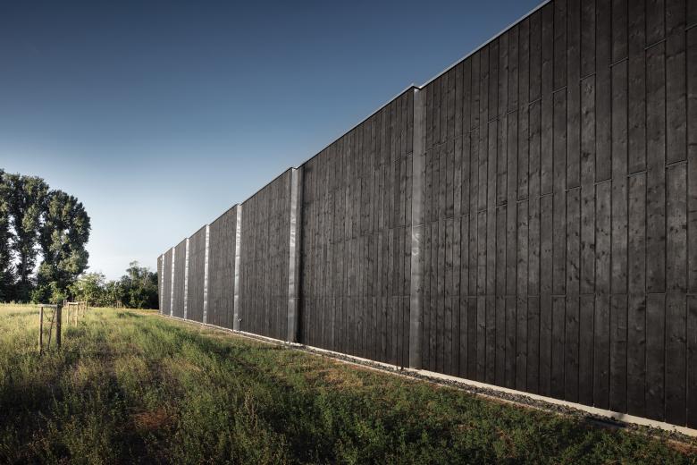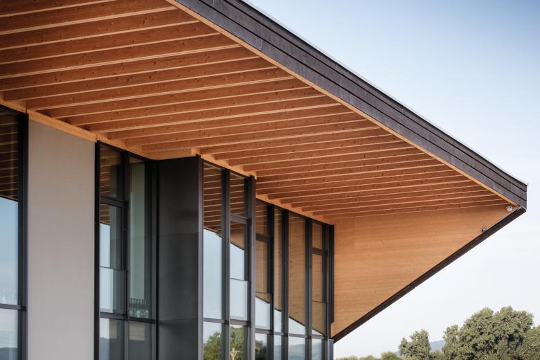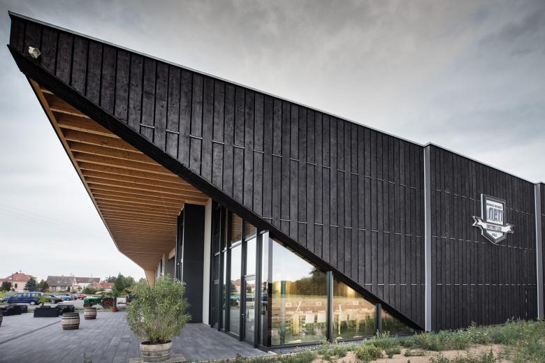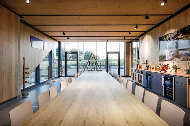 Realisiert wurde ein Holz-System-Leichtbau, dessen schwarze Außenhülle aus Holz durch die Anwendung der jahrtausendealten japanischen Shou-Sugi-Ban-Technik eine verblüffende Ästhetik bekommt: Dabei wird die Oberfläche durch Ankohlen geschützt, was dem Holz eine Art getoasteten Effekt verleiht. Die Hülle umspannt den massiven Innenausbau, der als thermischer Speicher aus Bims-Beton zur Nachhaltigkeit des Gebäudes beiträgt. In Form von markanten Sheds am Dach, die Licht und Luft ins Innere lassen, erinnert der Entwurf an die zeitgenössische Version eines japanischen Teepavillons, der hier in der Pfalz auf die Formensprache der Wiener Moderne trifft.