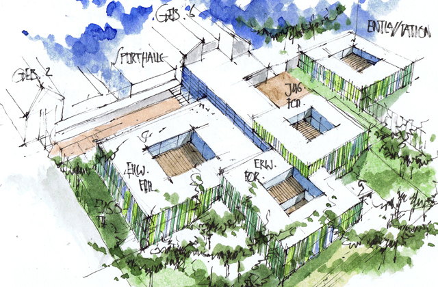 Gegenstand des Wettbewerbes war die Erweiterung des psychiatrisch-forensischen Bereiches und die Errichtung einer Jugendforensik. Die Gesamtnutzfläche der beiden Bereiche beträgt rund 6 000 Quadratmeter. In beiden Bereichen sind Stationen und Ergotherapiebereiche / Werkstätten enthalten. Die Freianlagen sowie ein Hochsicherheitszaun waren ebenfalls zu planen. Der Entwurf gliedert sich in 4 Bausteine, die - von Norden nach Süden steigend - die topografische Lage des Grundstücks aufnehmen und eine gute Ablesbarkeit der einzelnen Funktionsbereiche ermöglichen. Sie erwecken die Idee von Trittsteinen, die symbolhaft Schritt für Schritt den Weg der Patienten zur Wiedereingliederung in die Gesellschaft darstellen. RDS Partner wurde in der Folge mit der Realisierung der Maßnahme beauftragt.