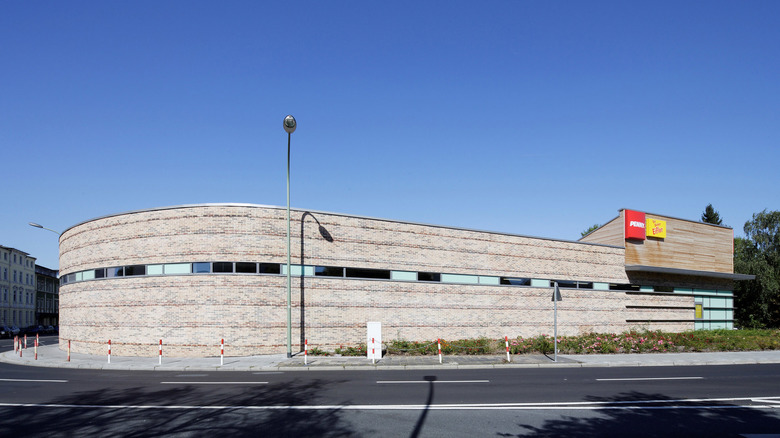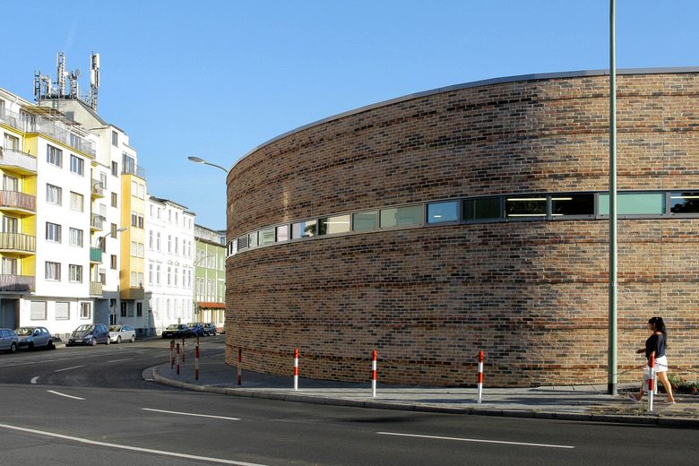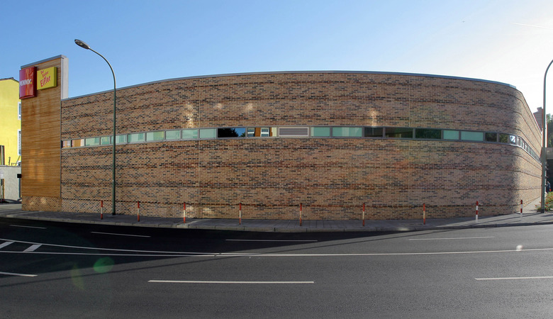 Als Auftakt in die Stadt gibt die vorbeiführende Bundesstraße die Dynamik für das Gebäude vor. Eine lebendige Klinkerfassade mit vorspringenden Bändern aus Mauerwerk und einem Fensterband dienen zur horizontalen Gliederung.
