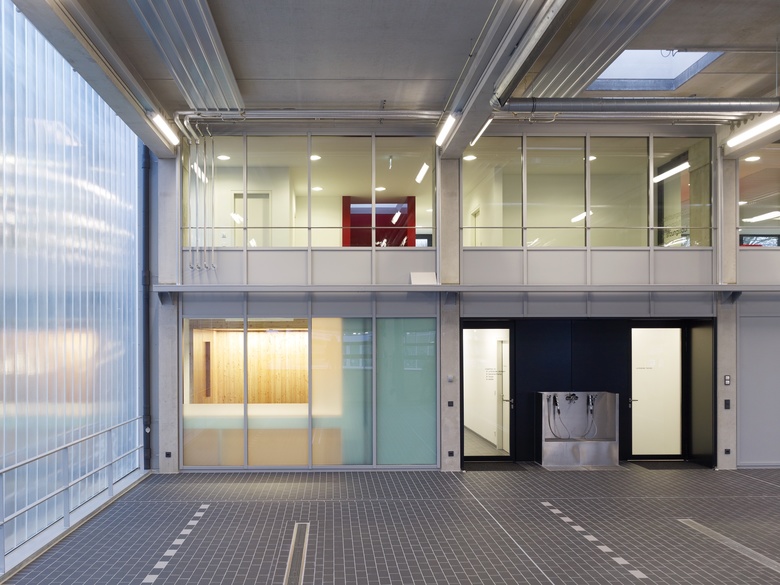 Über das Foyer geht es zu den am stärksten frequentierten Bereichen: den Umkleiden, der Fahrzeughalle und zum Sitzungssal im Obergeschoss. Die durchgehende Verglasung im Obergeschoss zur Fahrzeughalle stellt das zentrale Thema des Gebäudes in den Mittelpunkt: die Einsatzfahrzeuge. Der Blick vom Obergeschoss in die Fahrzeughalle gibt eine weitere wesentliche gestalterische Absicht preis: die prägnante Farbigkeit in den Aufenthalts- und Umkleidebereichen steht im Kontrast zu der fast surreal anmutenden lichten Fahrzeughalle mit ihrer raumhohen Verglasung aus gerilltem Profilbauglas.