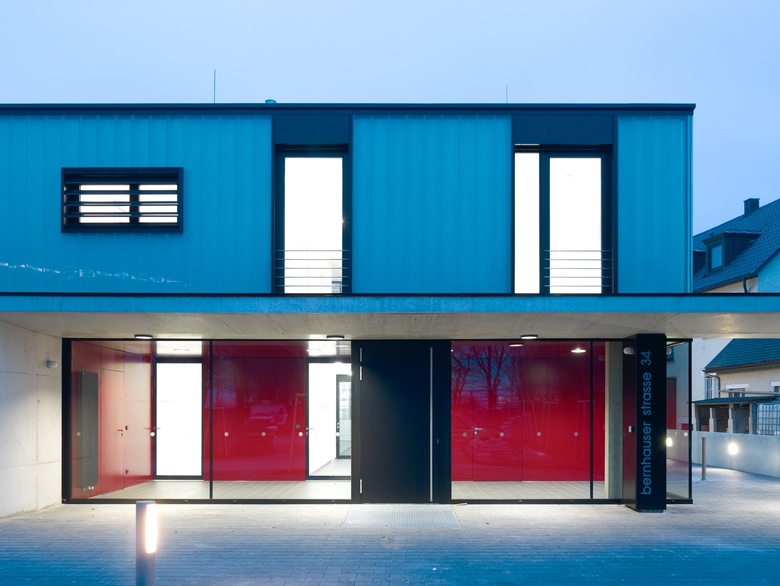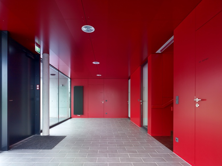 Mit seiner Proportion und der umlaufenden Industrieverglasung aus Gußglas orientiert sich der Neubau an seinem städtebaulichen umfeld - dem Gewerbegebiet Entenäcker. Die Transluzenz der Fassade ermöglicht auch die Ablesbarkeit der inneren Organisation des Gebäudes: die Fahrzeughalle mit 4 Stellplätzen und vorgelagertem Übungshof Richtung Osten | die Aufenthalts- und Umkleidebereiche, die über 2 Geschosse Richtung Westen angeordnet sind, und sich zum Parkplatz und Grünbereich hin orientieren. Der Neubau ist ein 2-geschossiger, präzise formulierter Kubus, der auf zwei Seiten "gestört" wird: zur Ostseite kragt das Dach um ca. 4,50 m aus, um die Zu- und Ausfahrt der Einsatzfahrzeuge zu schützen. Dieser "Ausschnitt" ist horizontal und vertikal mit Blechpaneelen verkleidet. Die Sektionaltore sind in der vertikalen Fläche integriert. Das mit rubinroten Holzplatten verkleidete Eingangsfoyer dient als "Schaufenster" zum Parkplatz im Westen und signalisiert eine übersichtliche Orientierung im Haus.