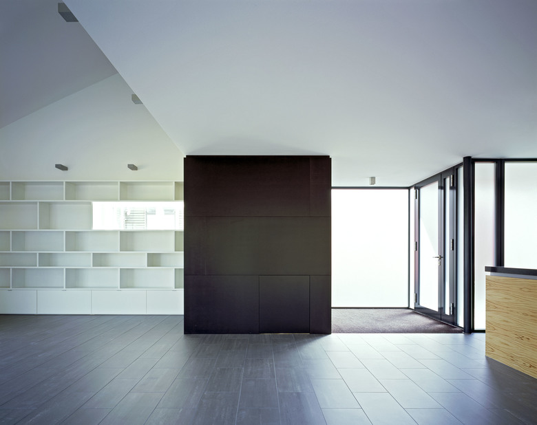 Konzipiert für eine Person mit Kind ist das Gebäude in zwei Bereiche gegliedert: Der Wohn- Aufenthalt -Schlafbereich über zwei Etagen mit eingestellten NebenraumKuben, nach dem Prinzip "Raum im Raum" und der Kinderbereich, als abgetrennte Raumeinheit, die später als Einliegerwohnung nutzbar ist. Das Gebäude ist von Osten über einen in die Fassade eingeschnittenen Zugangsbereich erschlossen.