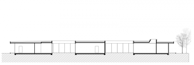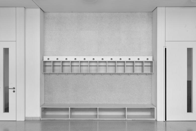 Während die Personal- und Nebenräume direkt hinter der lärmschützenden Betonschale liegen, sind die Gruppenräume vom Hausgrund zurückgesetzt angeordneten und mit einer Holzschalung sowie raumhohen Fensterelementen umfasst.