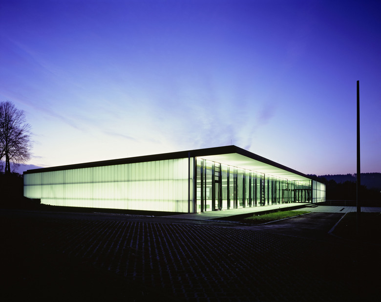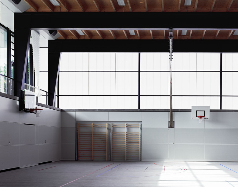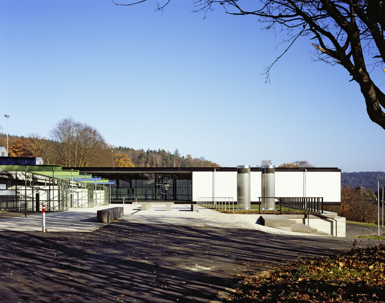 Östlich der bestehenden Dreifeldsporthalle, mit einem Geschoss in den Hang eingegraben, lässt sie durch die Abfangung mit einer talseitigen Sichtbetonwand einen attraktiven Pausenbereich für die Schüler entstehen. Unter dem Hof sind die beiden Hallen miteinander verbunden, teilen sich Umkleideräume, Sportgeräte lassen sich von Halle zu Halle transportieren. Alle wesentlichen Zugangszonen und Flure im Untergeschoss werden mit Tageslicht versorgt und leiten entlang eines Fensterbandes in die Umkleideräume. Die großzügige Überdachung des Eingangsbereiches auf Hofniveau bietet eine schützende Wartezone und leitet in das Foyer mit Blick auf die Dreifelderhalle. Eine dezente Materialität und Farbigkeit prägt den Raumeindruck: lindgrüne Wandoberflächen, schwarze Stahldachträger mit Holzelementfeldern und die umlaufende Stahl-Glas-Konstruktion, in der transluzente im Wechsel mit transparenten Glasflächen bewusste Ein- und Ausblicke gewähren.