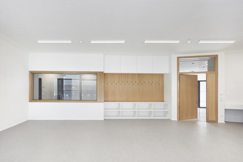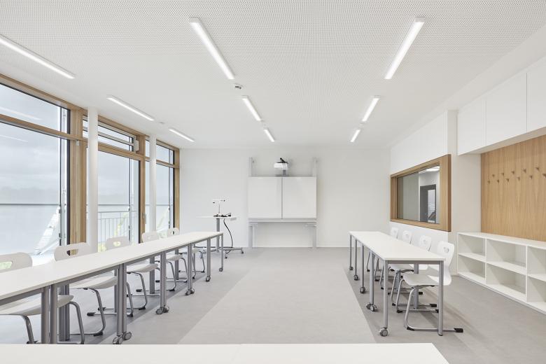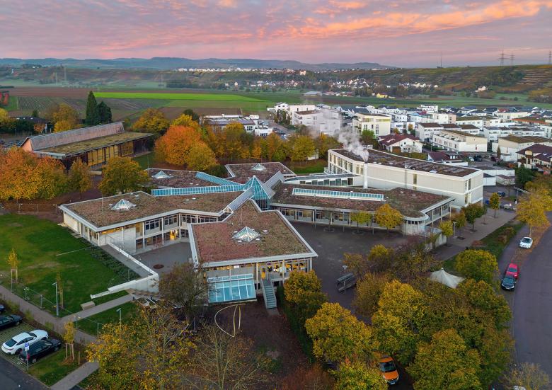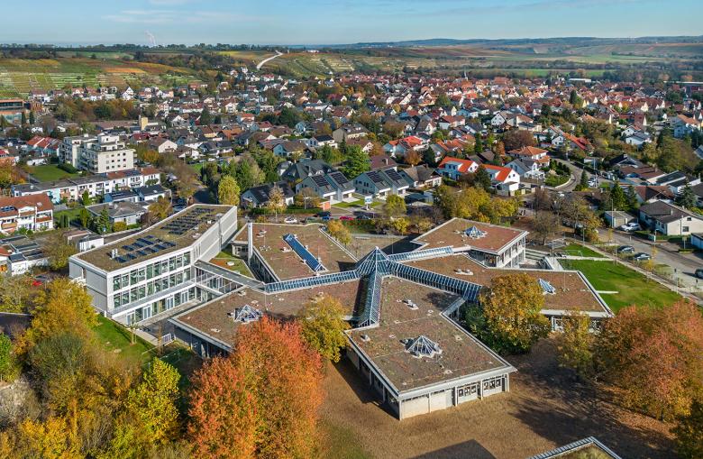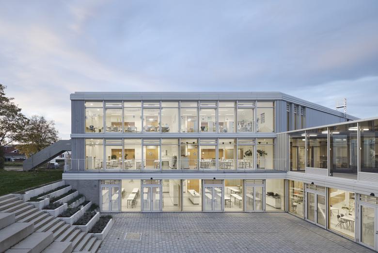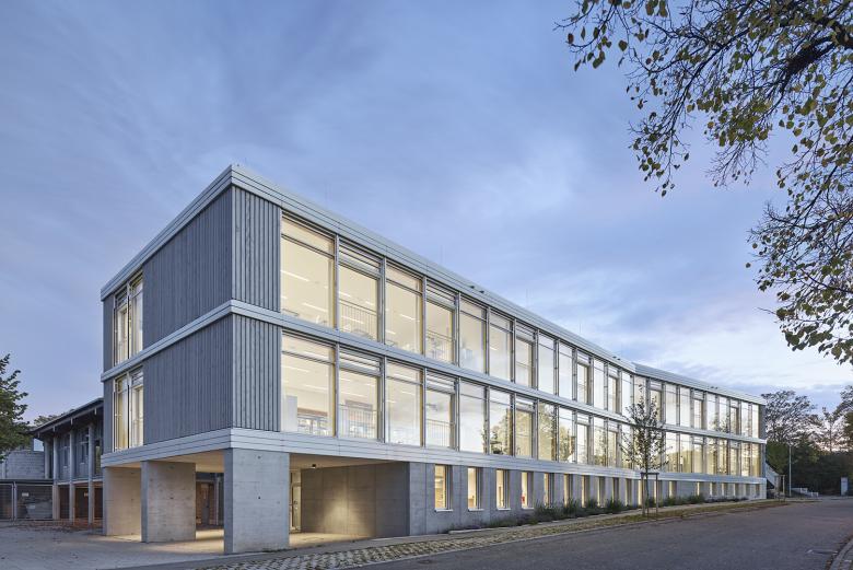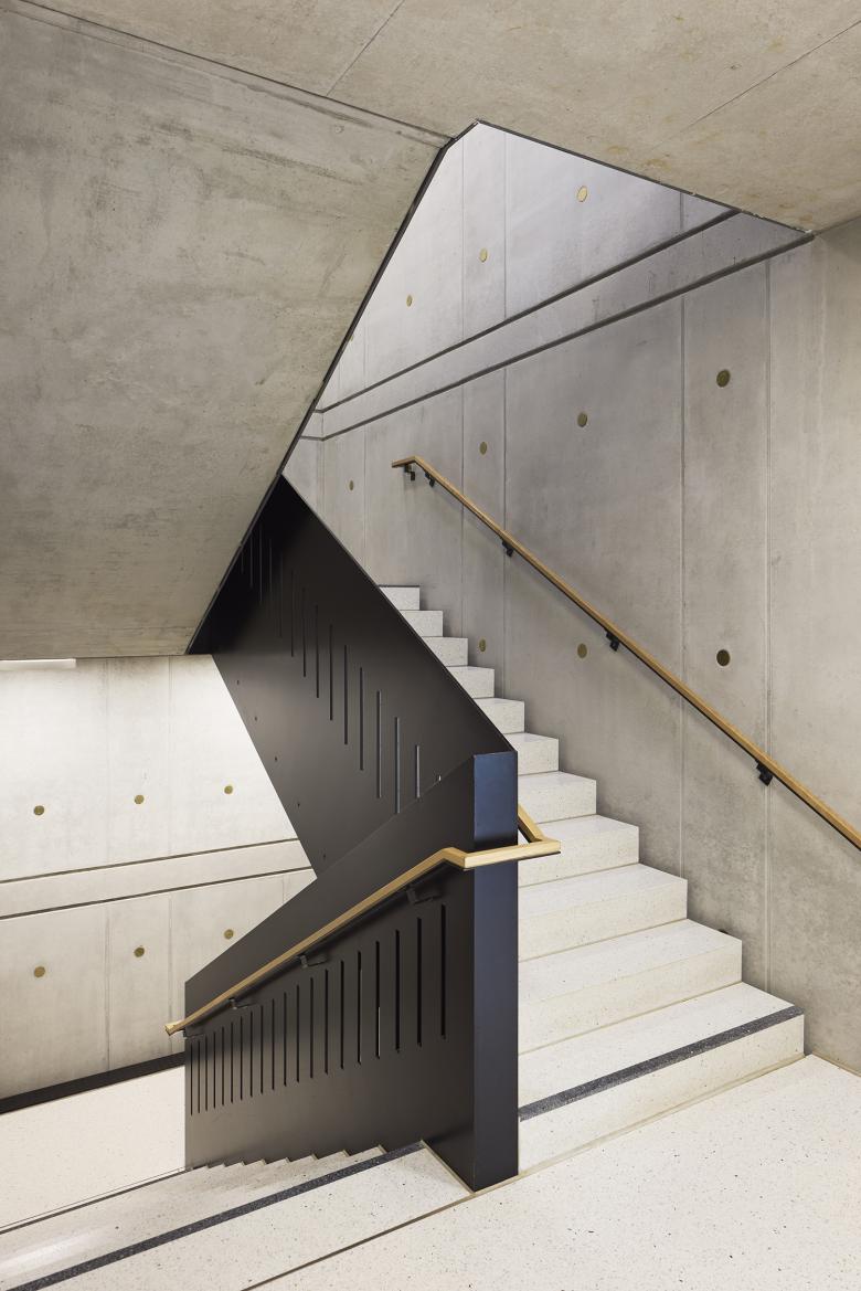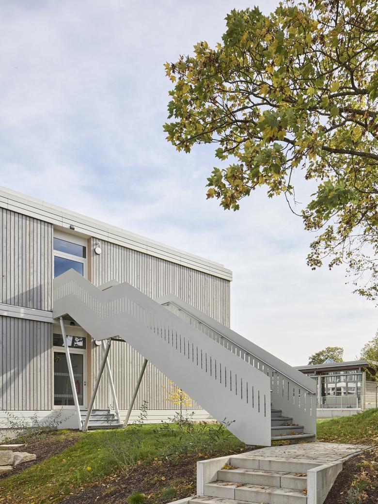 Hang mit Sitzstufen und gibt dem großen Aufenthaltsbereich Licht, Raum und die zusätzlich gewonnene Möglichkeit schulinterne Veranstaltungen. Die Erweiterung der Lehrerräume schiebt sich als eingeschossiger erdüberdeckter Baukörper unter den Hang und bildet mit dem Bestand einen introvertierten Ruhehof für die Lehrer. Der Neubau ist nun nicht nur über einen Verbindungsgang funktional verwoben mit dem energetisch, bau- und brandschutztechnisch instandgesetzten Bestandsgebäude.