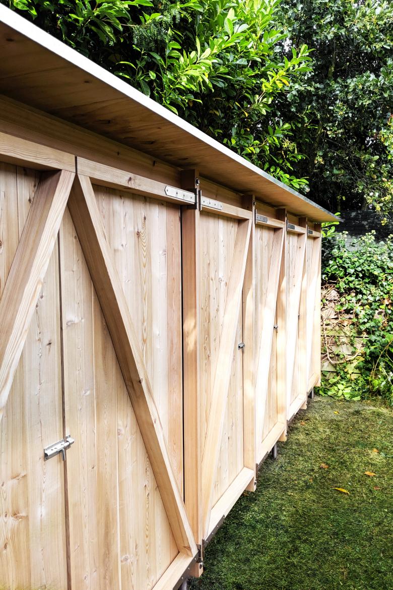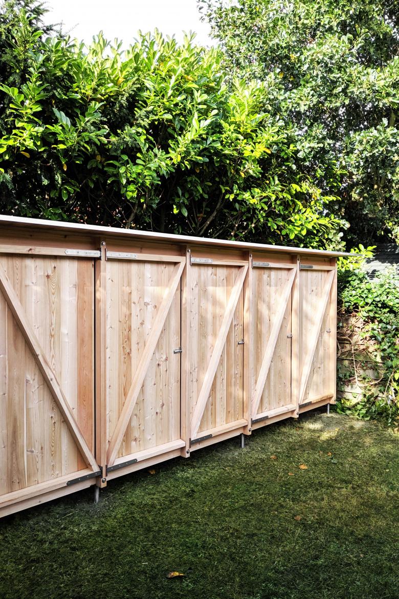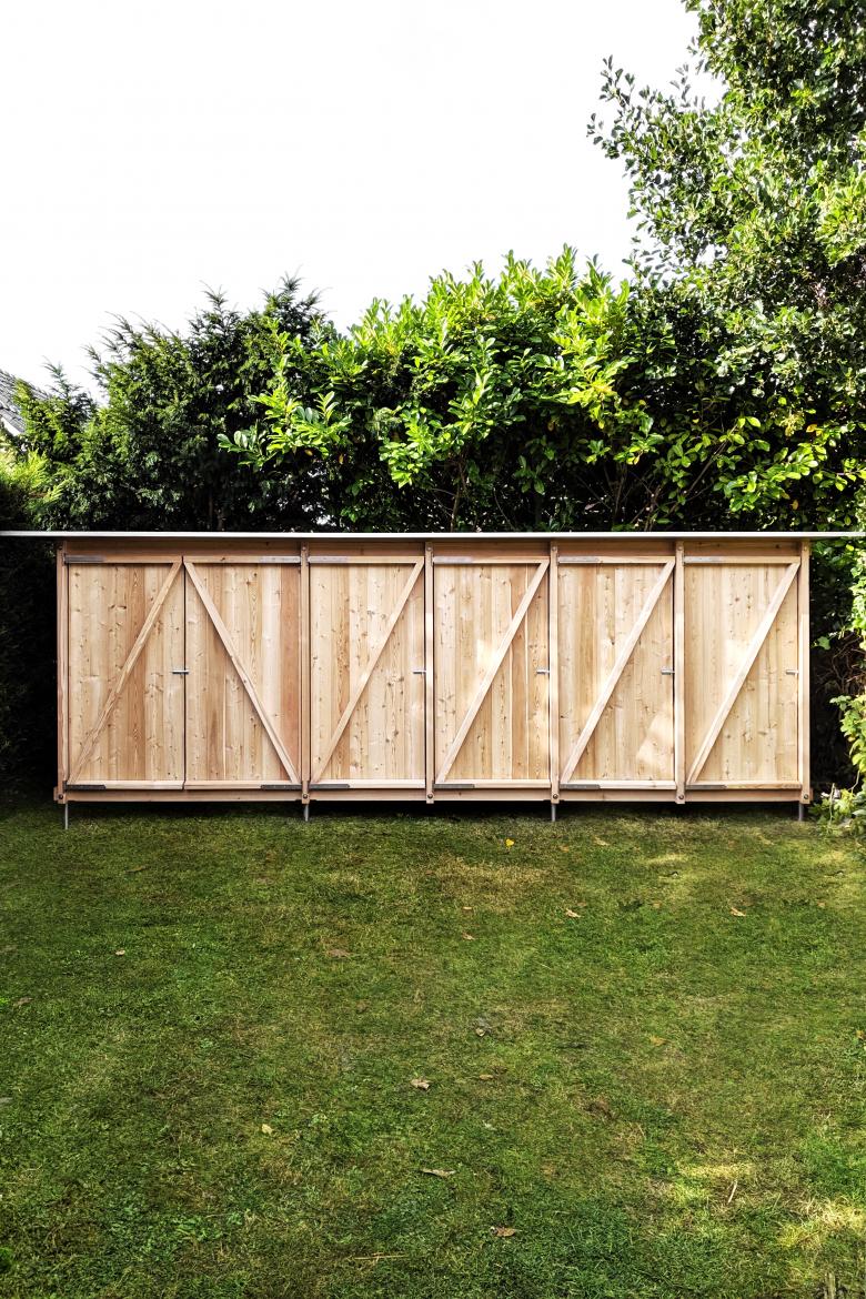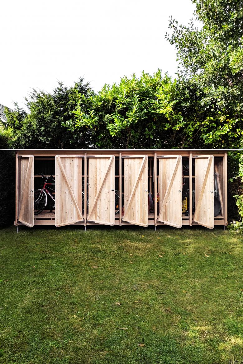 Einem Regal gleich, ist der Schuppen nicht begehbar und kann über Drehtüren beschickt werden.