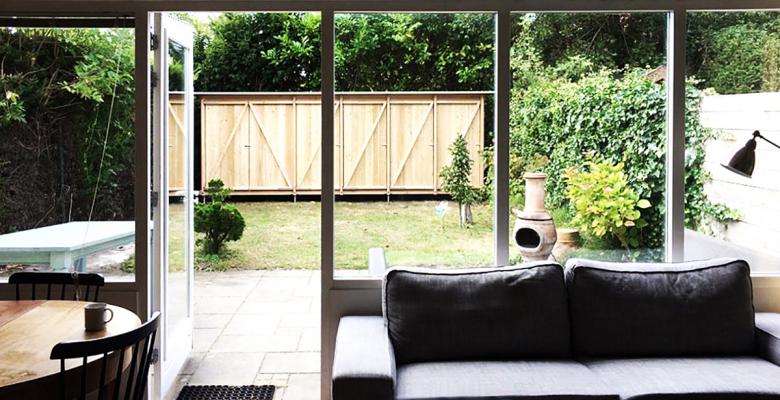 Der neue Baukörper bildet ein Gegenüber zur Gartenfassade des Wohnhauses und nimmt deren strukturelle Metrik auf.