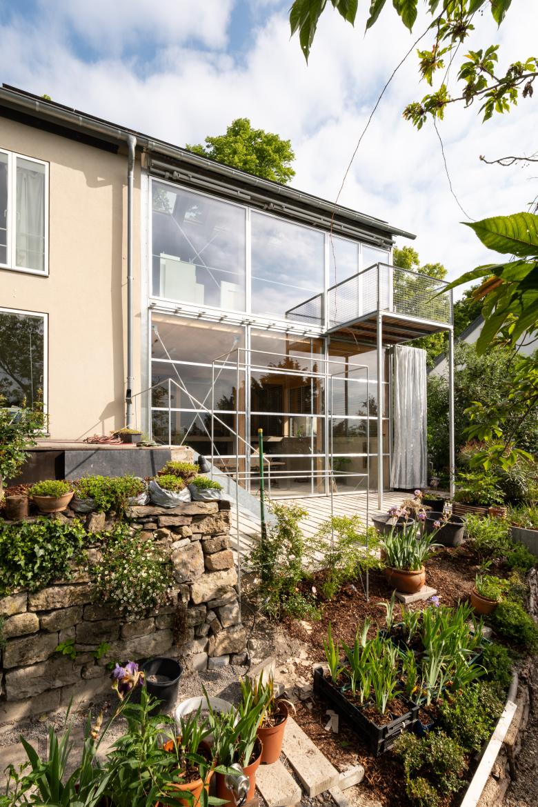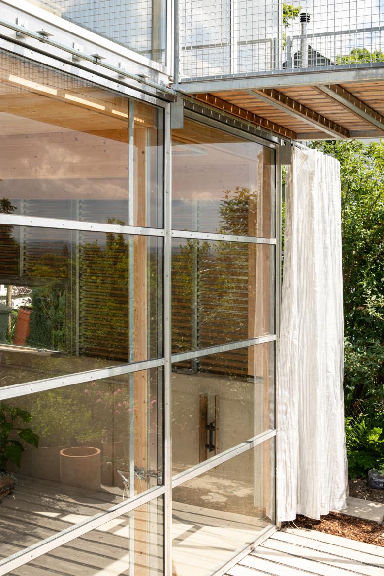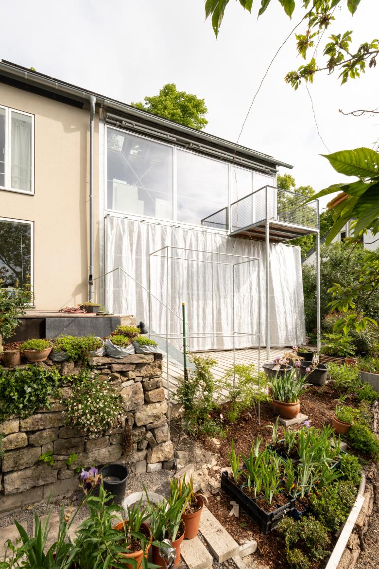 Die Erweiterung als Extrusion der bestehenden Kubatur schließt über einen Steg ebenerdig an das Straßenniveau. Damit entsteht ein zweiter und zugleich barrierefreier Zugang, der eine Vielzahl von Nutzungsszenarien ermöglicht. Das Gebäude kann nun horizontal und oder vertikal geteilt werden. Es bietet Raum für unterschiedliche Nutzer oder für gemeinschaftliches Wohnen in Generationen. Die Erweiterung dient derzeit als Atelier; ist zugleich aber auch autarke Wohneinheit.