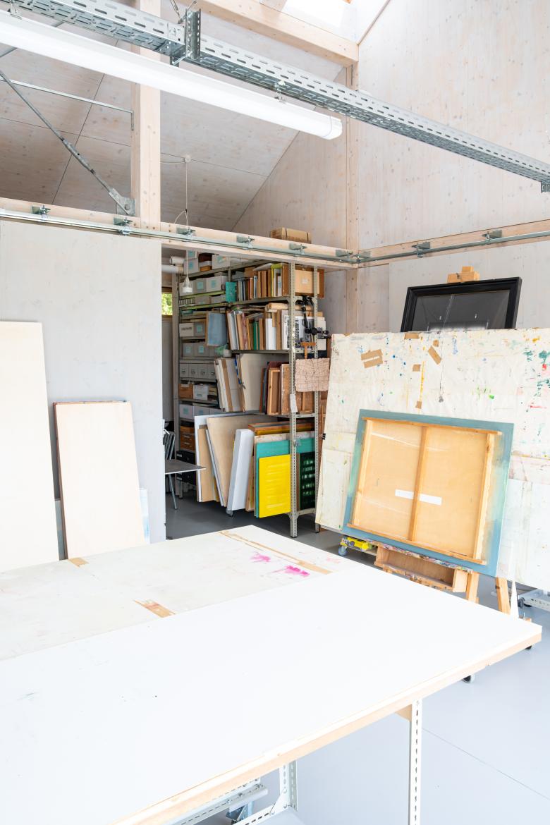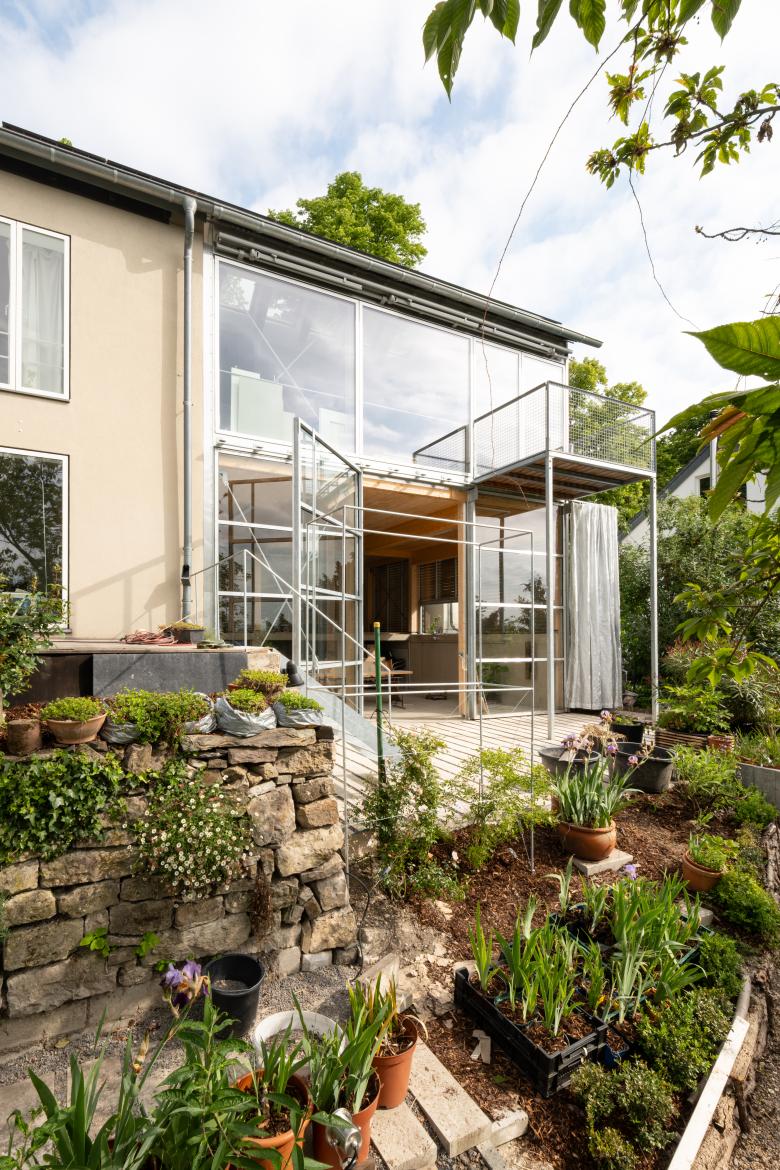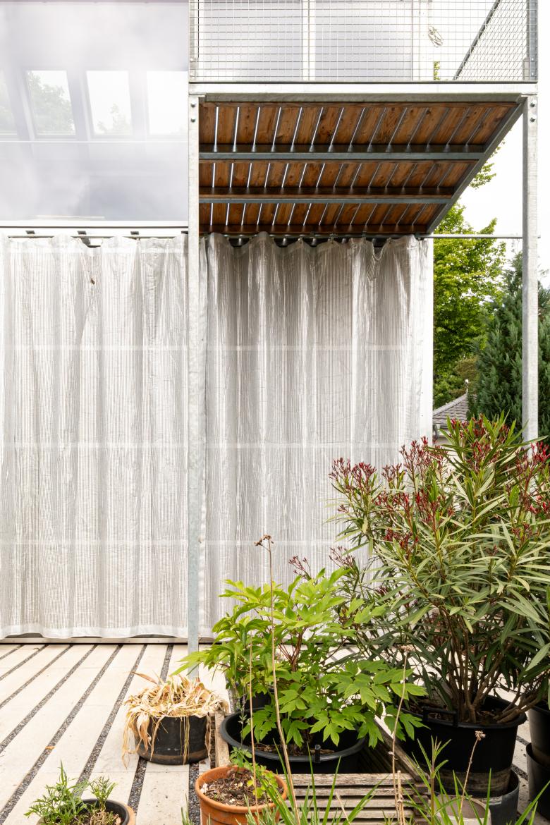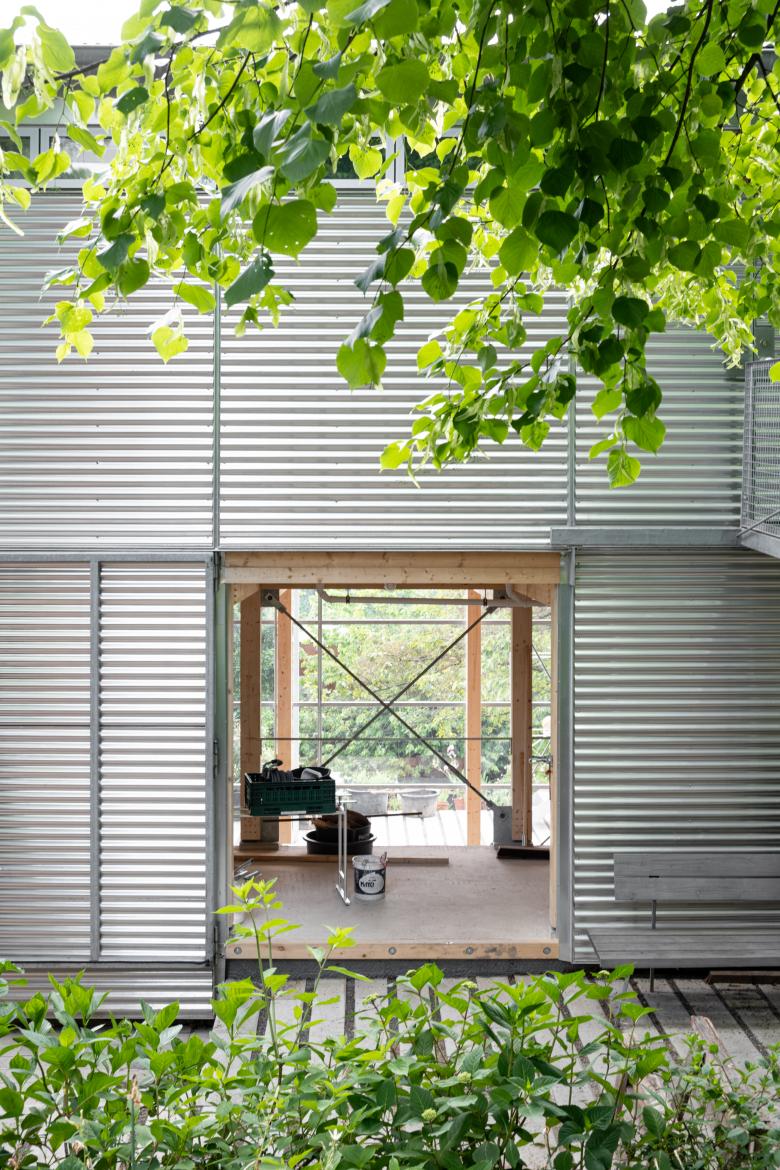 Die Erweiterung als Extrusion der bestehenden Kubatur schließt über einen Steg ebenerdig an das Straßenniveau. Damit entsteht ein zweiter und zugleich barrierefreier Zugang, der eine Vielzahl von Nutzungsszenarien ermöglicht. Das Gebäude kann nun horizontal und oder vertikal geteilt werden. Es bietet Raum für unterschiedliche Nutzer oder für gemeinschaftliches Wohnen in Generationen. Die Erweiterung dient derzeit als Atelier; ist zugleich aber auch autarke Wohneinheit.