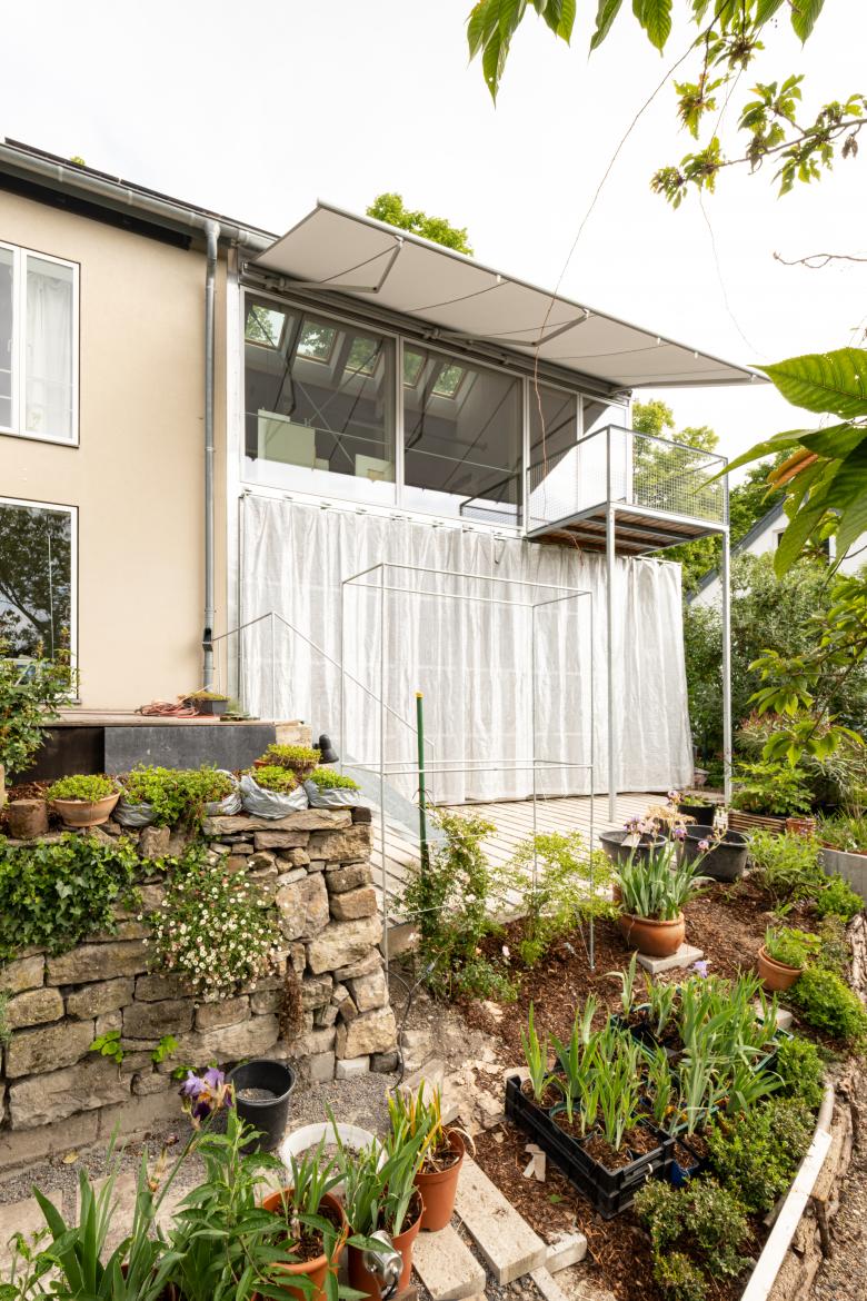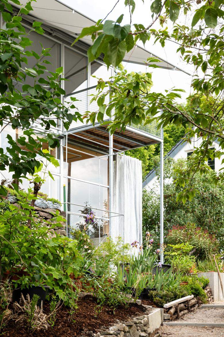 Gebaut wird in Holz. Ein einfaches Skelett von 8x7 Metern hebt die neue Nutzungseinheit ein Geschoss über die Gartenebene. Straßen- und Obergeschosslevel werden zugleich bedient. Der Baukörper ist in ein hinterlüftetes Kleid aus Aluminiumwelle gehüllt. Die bestehende Haustechnik versorgt den Neubau gleich mit. Der Blick aus dem Inneren richtet sich südlich ins Tal der Stadt, das Licht kommt aus Norden.