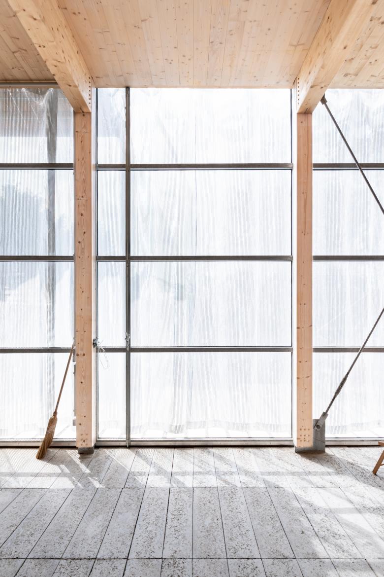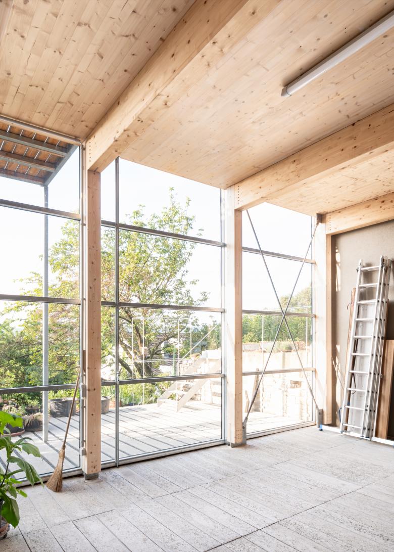 Darunter entsteht ein Raum. Er ist da, fast 4 Meter hoch und er ist kalt – unbeheizt und nicht gedämmt. Ein Gartensaal! Und es zeigt sich, dass gerade dieser "primitive" Raum zum neuen Ort des Lebens wird. Er bildet Herz und Bindeglied zwischen Alt, Neu und Natur.