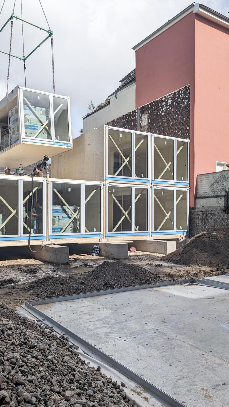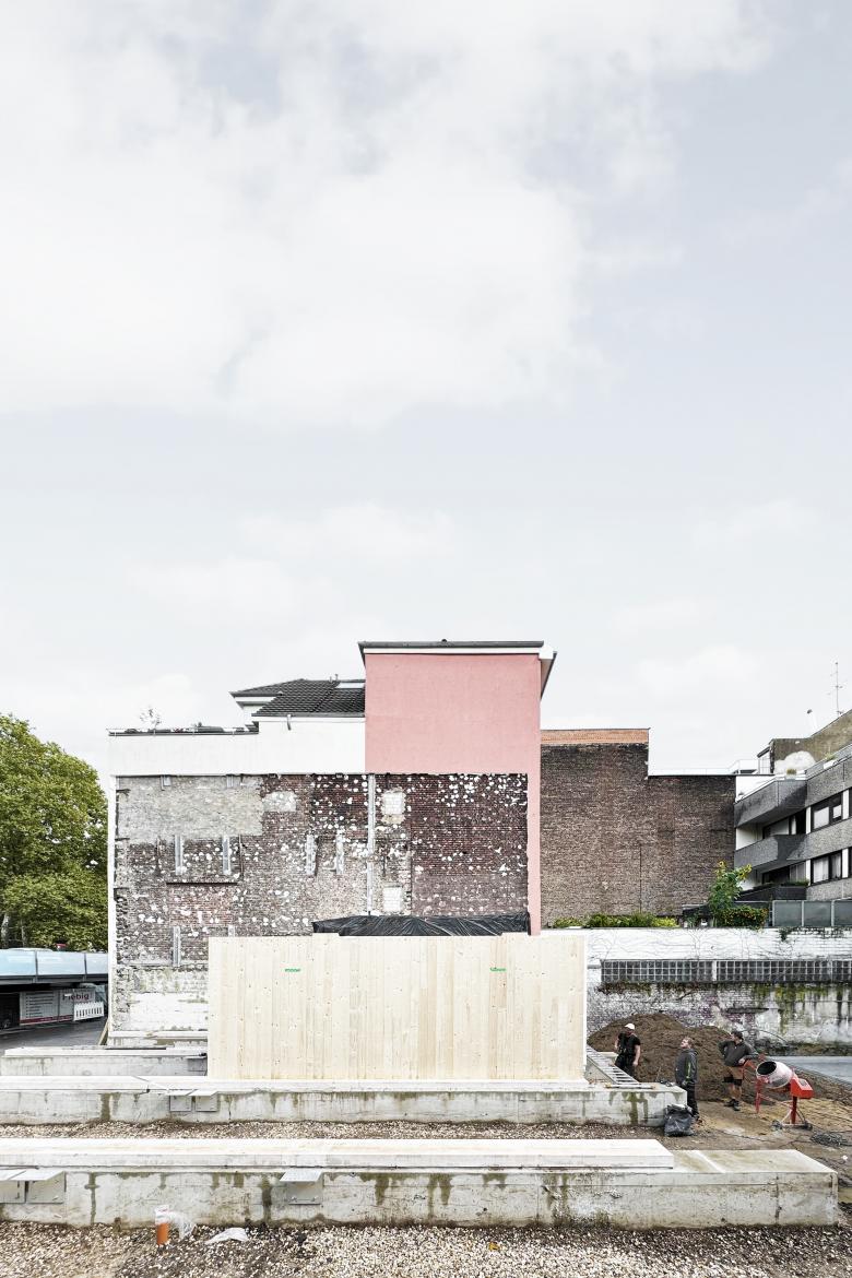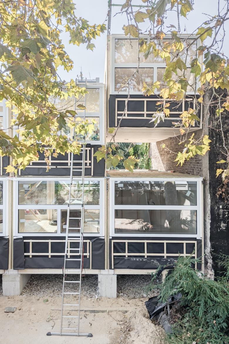 Die gut 25 Meter breite Baulücke wird innerhalb von 10 Tagen mit 32 drei Meter breiten, vorgefertigten Holzmodulen gefüllt. Aufgebockt auf pfahlgegründeten Streifenfundamenten – auf eine Betonbodenplatte und viel Eisen wird verzichtet, vermittelt der Baukörper zwischen den unterschiedlichen Höhen der Anrainer, schließt den Block und schafft individuelle Lebensräume im charakteristischen Gewirr von Alt und Neu.