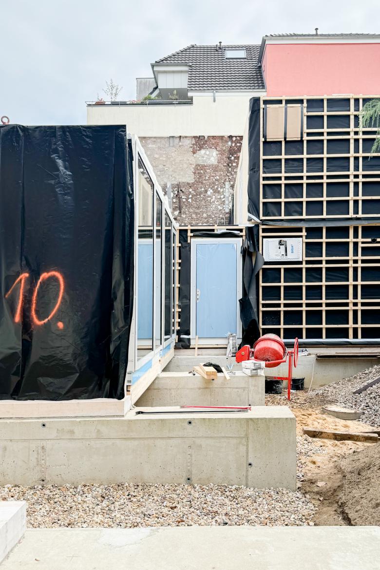 Die Nordfassade ist glatt; der Südfassade wird ein Stahl-Holzskelett vorgestellt, dass den Sonnenschutz konstruktiv löst – Einer mechanischen Verschattung bedarf es nicht. Es entsteht ein Pufferraum zum nahliegenden Bestand, der Privatheit bei gleichzeitig maximaler Tagelichtversorgung bietet. Der Neubau wird über den Hof durch das Bestandgebäude erschlossen. Hier werden auch die geforderten acht Stellplätze in einen ebenbündigen Tiefparksystem untergebracht. Auf dem niedrigeren Gebäudeteil entsteht eine großzügige Pergola auf intensiver Dachbegrünung. Die restlichen Dachflächen sind extensiv begrünt und werden zur Unterstützung der Fernwärme mit PV belegt. Zwischen Grenzmauer und Neubau entsteht ein kleiner privater Garten inmitten der Stadt.