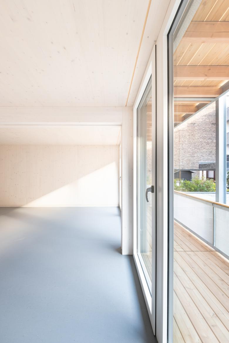 Gebaut wird mit Brettsperrholz, Holz-Alu-Fenstern und vorgehängt-hinterlüfteten Fassaden. Keine Kunstoffenster. Kein WDVS. Die Holzwände und Decken bleiben sichtbar, ihre Materialität bleibt erhalten, schafft Behaglichkeit und ein gesundes Wohnklima auf flächigem Linoleumbelag.