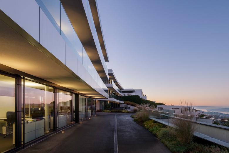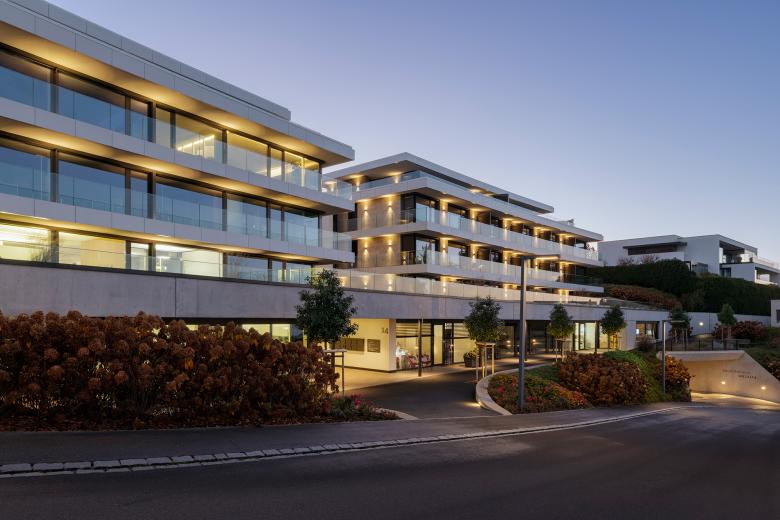 Einen aussergewöhnlichen Spagat aus scheinbar Widersprüchlichem schafft die Terrassenüberbauung «Lake Side» in Schindellegi: Ruhe und Geborgenheit für die Bewohnerschaft an einer viel befahrenen Strasse Mitten im Ortskern. Die hochwertige Überbauung, die durch eine elegante Wölbung besticht, besteht aus komfortablen Mietwohnungen im Langbau, Büroräumen im Punktbau und Gewerbeateliers im Sockelgeschoss. Die Architektur zeigt durch die Geschossdecken seeseitig eine deutliche Horizontal-Struktur und ist mit grossen Glasflächen sehr offen realisiert. Bedingt durch die Lärmemissionen wurde die Überbauung bewusst bergseitig weitestgehend verschlossen. An der arabischen Baukultur bedient sich das Fassadensystem der Tradition der Mehrschichtigkeit. Die Fassade des Wohn- und Geschäftshaus setzt sich aus drei Ebenen zusammen. Neben der Eigenschaft des Lärmschutz übernimmt dieser Schichtaufbau auch die Funktion, Privatsphäre zu spenden und für Rückzugsmöglichkeiten zu sorgen sowie als Gestaltungselement die zurückhaltende Eleganz zu illustrieren.
