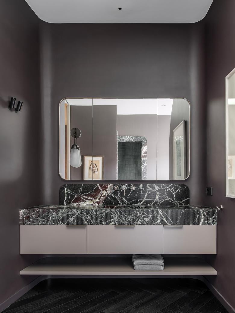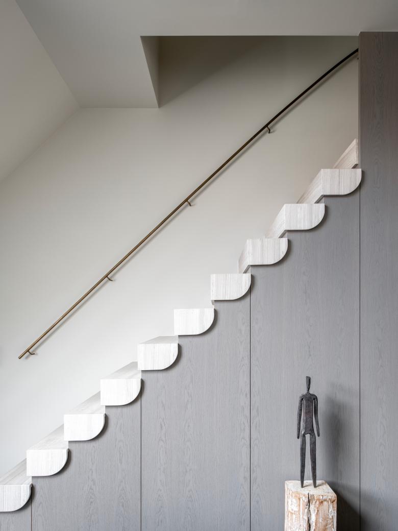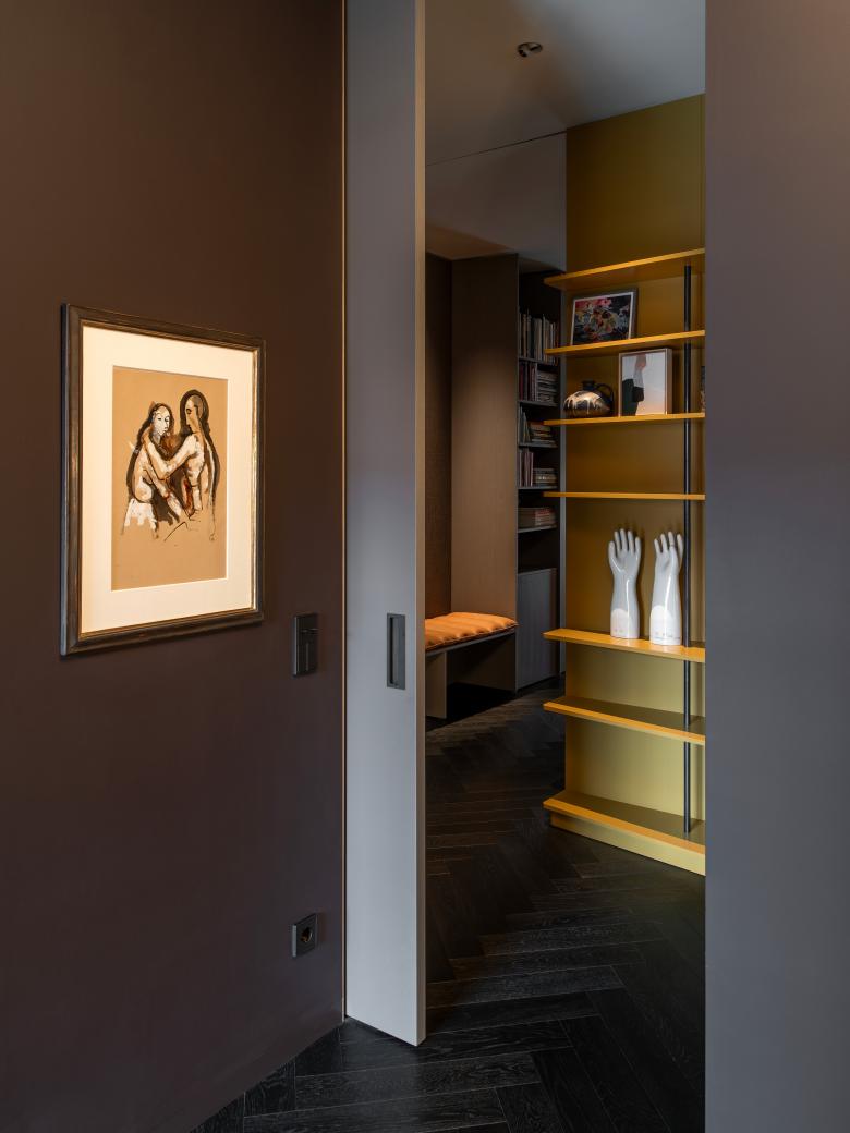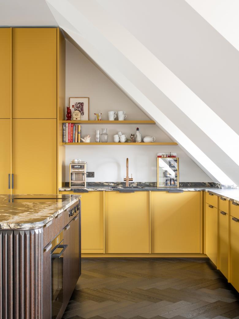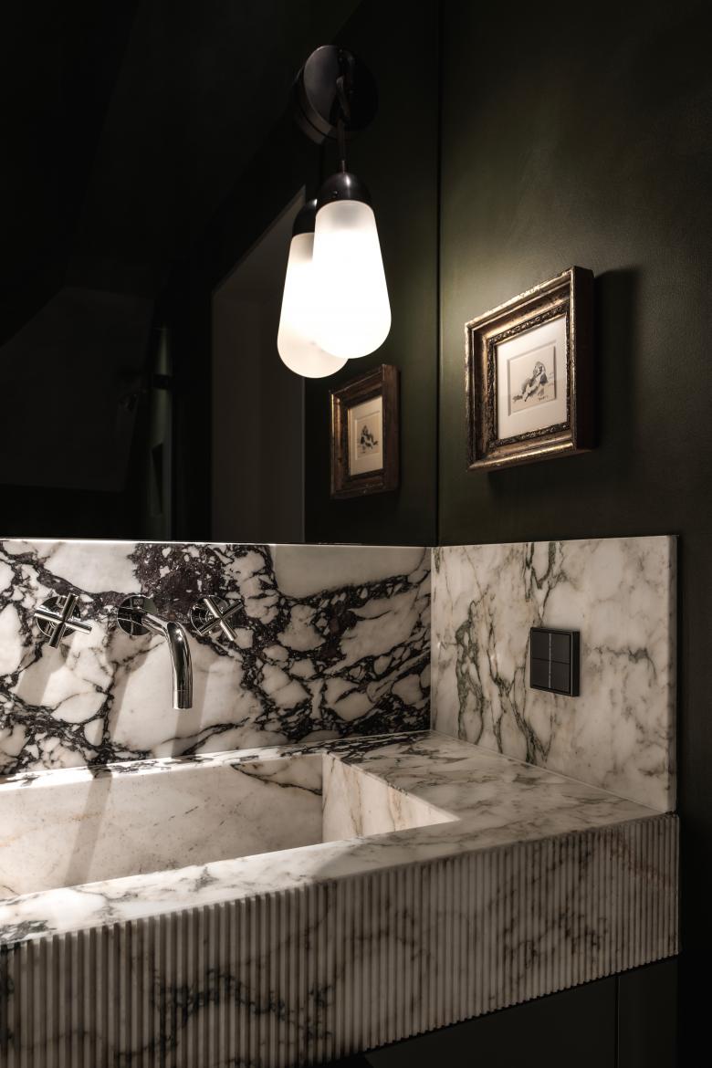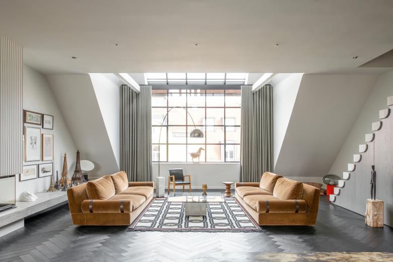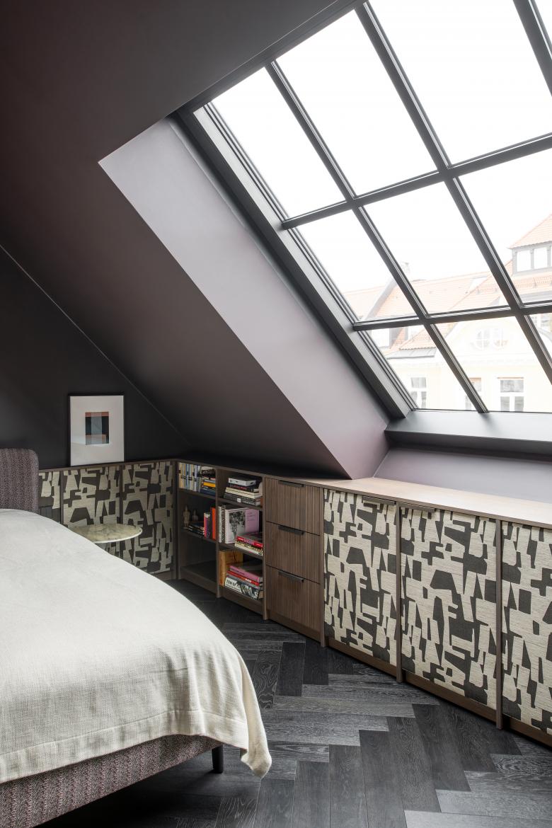 Arnold / Werner verwandelte ein ehemaliges Künstleratelier im Dachgeschoss eines denkmalgeschützten Schwabinger Jugendstilhauses in eine großzügige Wohnlandschaft. Nach einer gründlichen Kernsanierung mit neuer Grundrissaufteilung bildet der lichtdurchflutete Hauptraum mit markantem Atelierfenster den Mittelpunkt der Wohnung. Hier liegt der Wohnbereich mit offener Küche, dessen maßgefertigter Innenausbau eine ebenso klar strukturierte wie sinnliche Farb- und Materialwelt entstehen lässt. Raumprägende Elemente sind insbesondere der Parkettboden aus schwarz gebeizter Eiche sowie die pointierten Akzente ausgesuchter Natursteine: dunkler Quarzit für die Küchenarbeitsflächen, heller Travertin für eine lange Kaminbank und weißer Marmor für die Treppenstufen ins offene Galeriegeschoss des ausgebauten Dachspitzes.