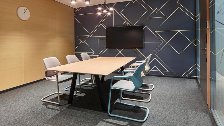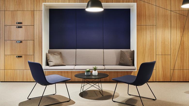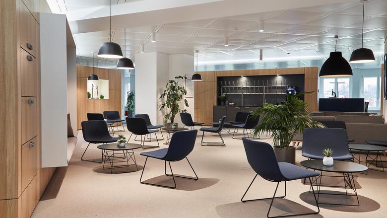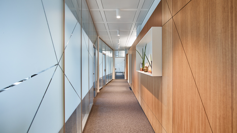 Der Bedarf an natürlichem Licht teilt das Gebäude in zwei Bereiche. Entlang der Fensterfront befinden sich auf fünf Stockwerken neue Arbeitsplätze für rund 400 Mitarbeitende, während die soziale Interaktionszone Besprechungsräume, Netzwerk- und Ruhezonen und eine Cafeteria umfasst. Die zwei Bereiche sind durch eine Membranwand abgetrennt, die sich durch alle Stockwerke zieht. Die Holzwand wirkt sowohl lichtdurchlässig als auch schallabweisend. Zusätzlich dient sie als Garderobe, Teeküche oder Telefonkabinen.