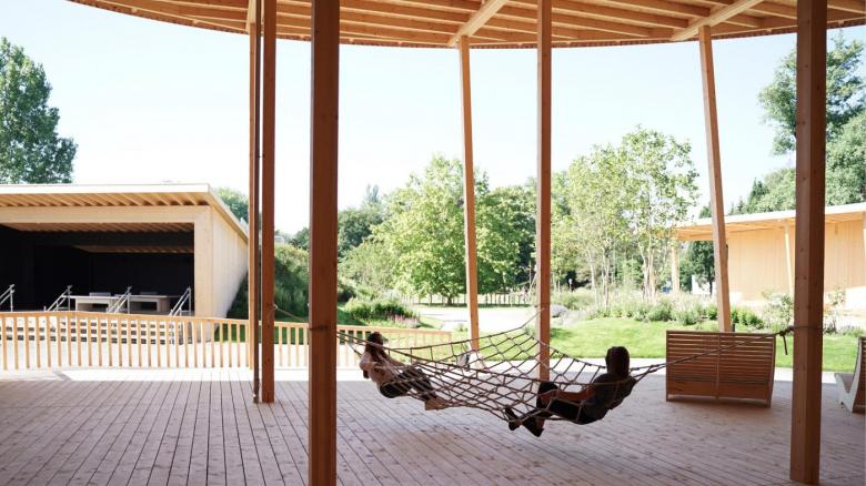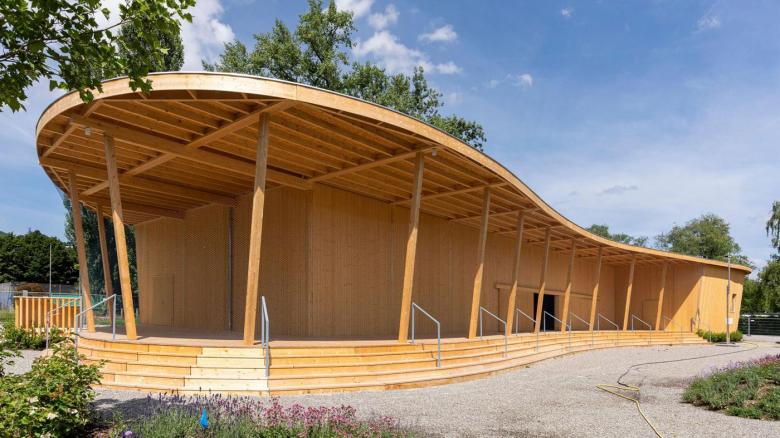 Um der Bevölkerung dennoch im Sommer 2020 einen Erholungsraum anstelle einer abgesperrten Baustelle zu bieten, wurde ein Teil des Geländes provisorisch fertiggestellt. Auf Nachhaltigkeit legen wir Wert: Die verwendeten Materialen erhalten ein zweites Leben. Die Pavillons werden zudem in das Theater Spektakel 2020 und 2021 integriert.