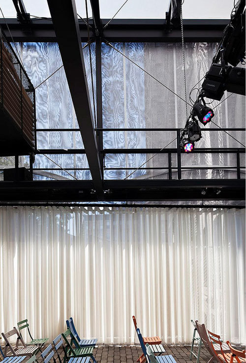 The structure’s lower half is a present-day version of the Mediterranean loggia, an open space that can easily be configured to accommodate the Lab’s various programs. The upper part of the structure houses a flexible rigging system and is wrapped in a semitransparent mesh. Through this external skin, visitors are able to catch glimpses of the extensive apparatus of “tools” that may be lowered or raised from the canopy according to the Lab’s programming needs, transforming the ground space into a formal lecture setting, a stage for a celebratory gathering, or a workshop with tables for hands-on experiments.