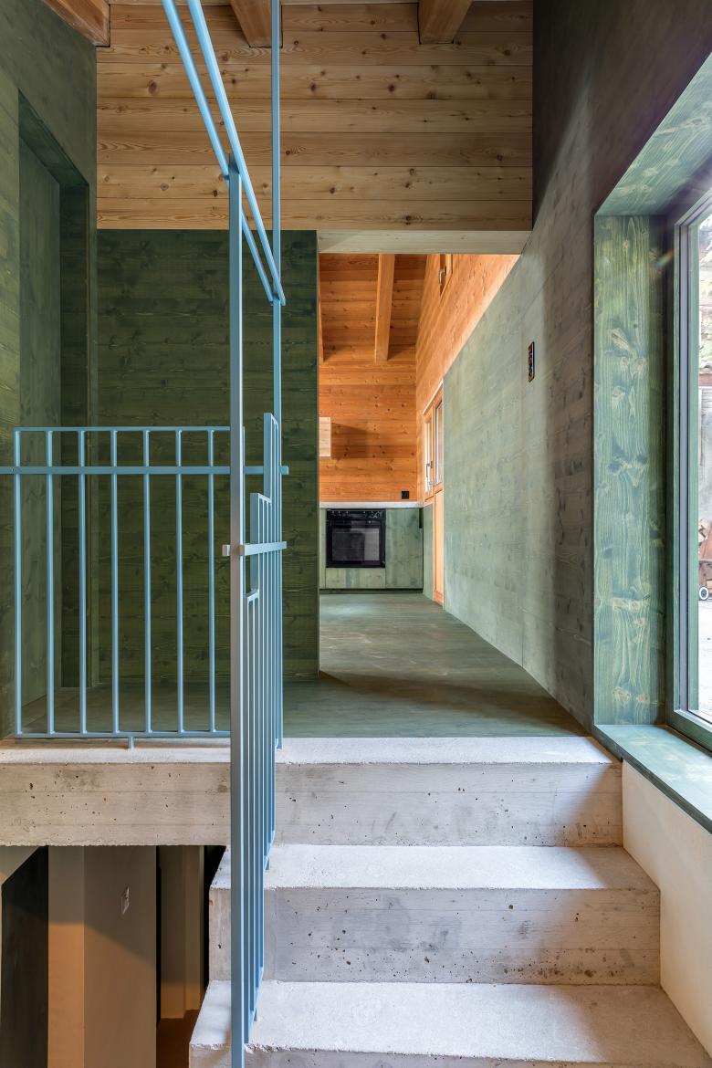 Eine neue spindelartige Betontreppe verbindet das Obergeschoss mit dem Sockelgeschoss und integriert das Gäste-WC auf dem Podest. Die Materialien aus dem Obergeschoss des Strickbaus, Innen geölte Holzschalung, fliessen in den Sockelbau aus Beton, Innen Lehmputz, über.