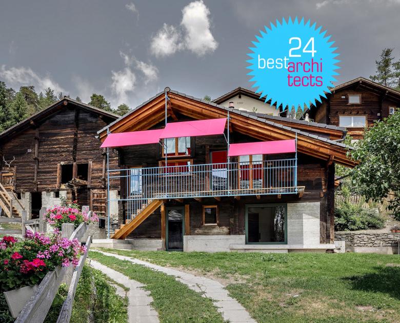 Das historische Chalet der Bauherrschaft liegt inmitten dieses Microkosmos und wurde im Laufe der Jahre mehrfach umgebaut. Im Zuge der Sanierung stand einerseits der respektvolle Umgang mit der historischen Bausubstanz, aber auch eine wirkungsvolle Kombination mit zeitgemässer Architektursprache im Vordergrund. So ist es gelungen, neue und alte Bauteile effektvoll zu einem gemeinsamen Ganzen zu fügen und dem ehrwürdigen Chalet ein frisches aber dennoch selbstverständliches Erscheinungsbild zu verleihen. Der spielerische Umgang mit Farbigkeit und Materialität trägt dazu bei, bestehende und neue Bauteile deutlich ablesbar zu machen. Neue Fensteröffnungen sind zudem präzise gesetzt und lassen die einmalige Landschaft Teil des Chalets werden.