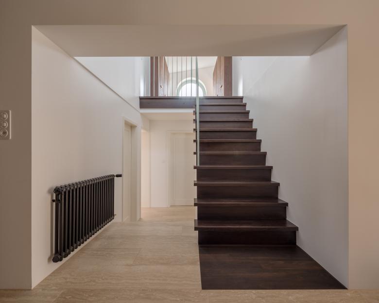 Bei der inneren Materialisierung der Oberflächen wurde ebenfalls an die klassische und hochwertige Eleganz des Bestandes angeknüpft. Travertin für die Böden in der Eingangshalle, der Küche sowie den Bädern. Alle Schreinerarbeiten sind mit einem geölten Eichenholzfurnier ausgeführt und werden mit einem Eichenparkett in der gleichen Farbe im Dachgeschoss ergänzt.