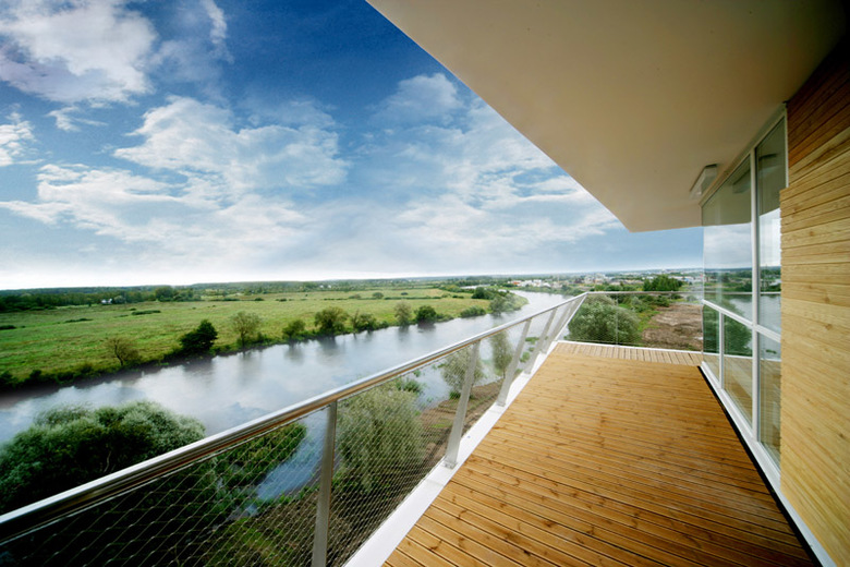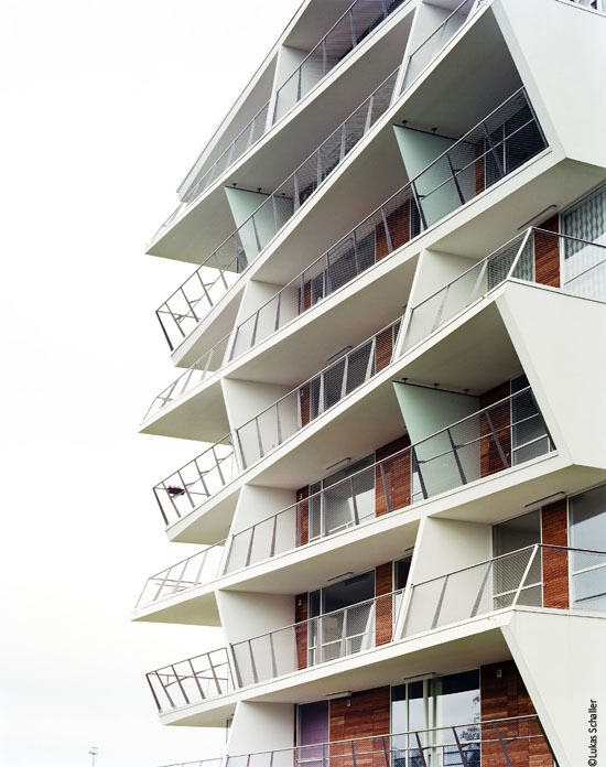 The exterior ring is made up of the living areas found in houses, offering enough sunlight exposure and vast landscape views. Since the structural elements are concentrated in the inner ring, the area is more open, offering flexibility with the organization of its spaces. The thin movable walls are simplified to meet the needs of its changeable inhabitants over the years. The exterior ring is surrounded by a continuous balcony and through its irregular shape creates an authentic space that offers each house a completely different private outdoor area. This type of balcony was designed in order to lighten the visual volume of the building and integrate it into the landscape.