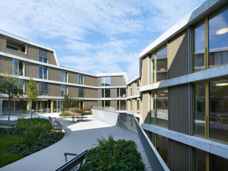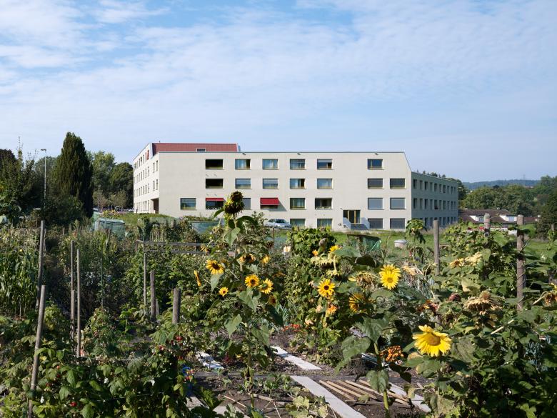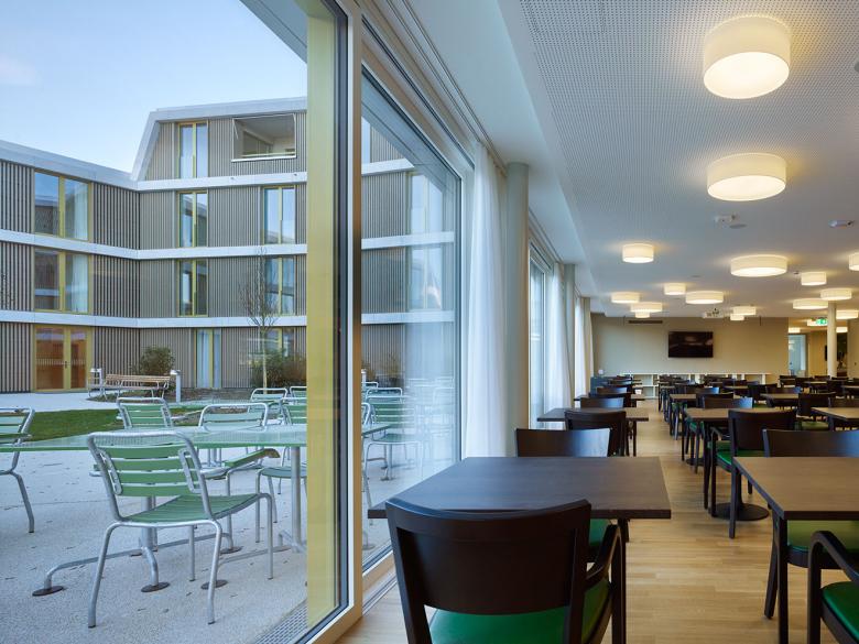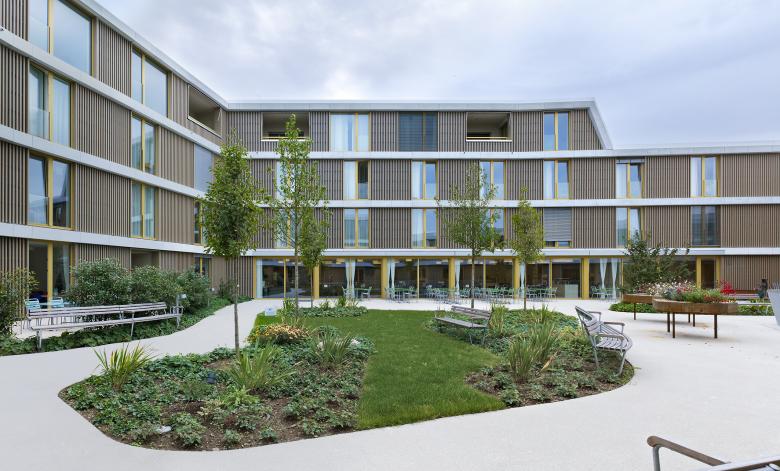 Die beiden Nutzungen von Wohnen und Pflege erhalten je eigenständige Bereiche und profitieren von den Qualitäten des Standorts: gute Anbindung an das Siedlungsgefüge, Parkanlage im Süden und privilegierter Landschaftsbezug in Richtung Norden.