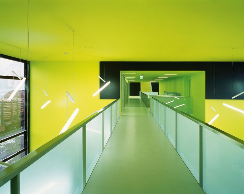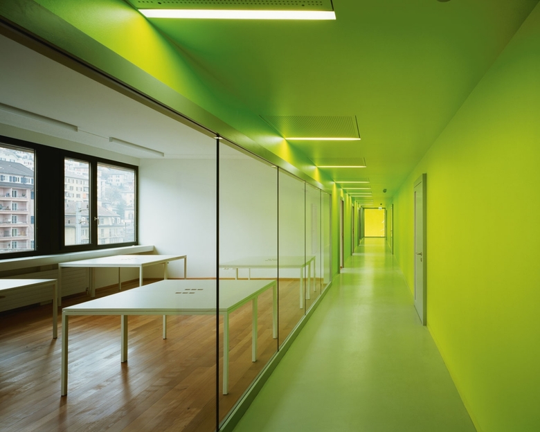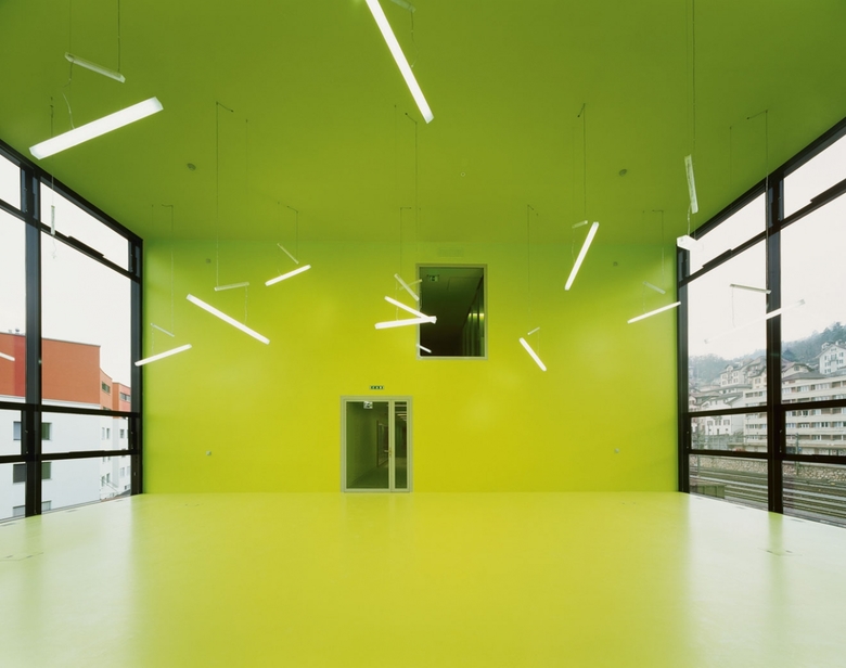 Dieser direkt an der Bahnlinie gelegene Ausbildungsbau beherbergt zwei unterschiedliche Institutionen. Drei Hauptelementen strukturieren das Gebäude. Ein langer, vierstöckiger Riegel bildet das Rückgrat und markiert eine klare Abgrenzung zum Bahngelände. Zweigeschossige, transparente Öffnungen gliedern den Riegel in der Vertikalen. Ebenfalls zweigeschossige Volumen durchdringen den Riegel. Ihre Auskragungen auf der Frontseite gliedern den zukünftigen zentralen Platz des Quartiers.
