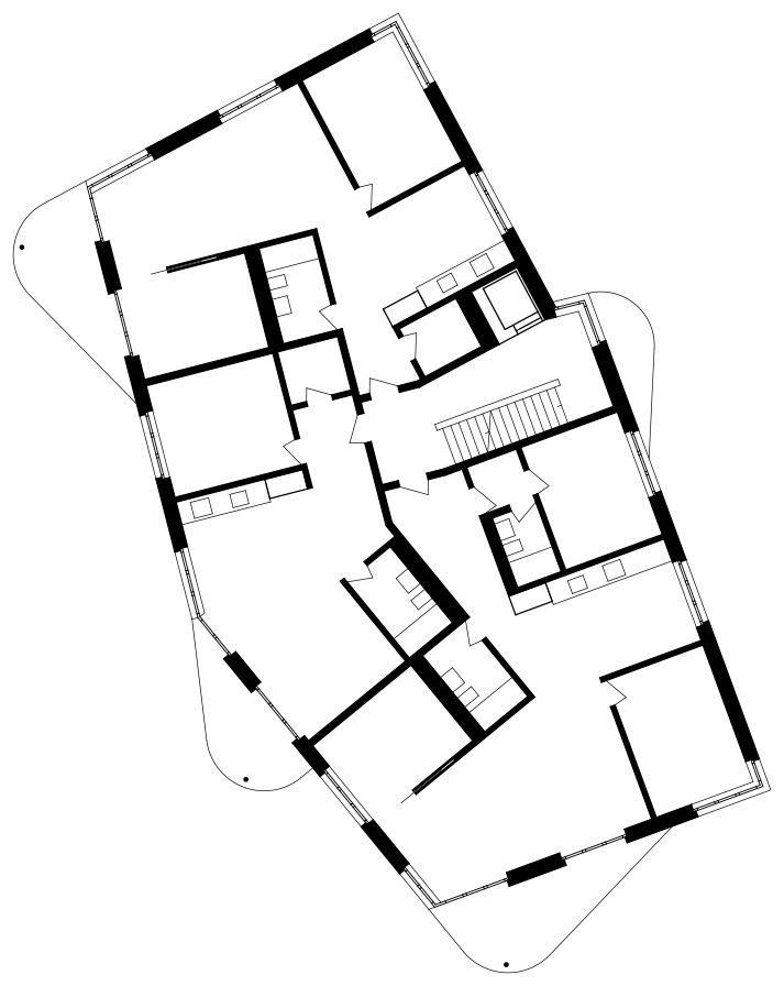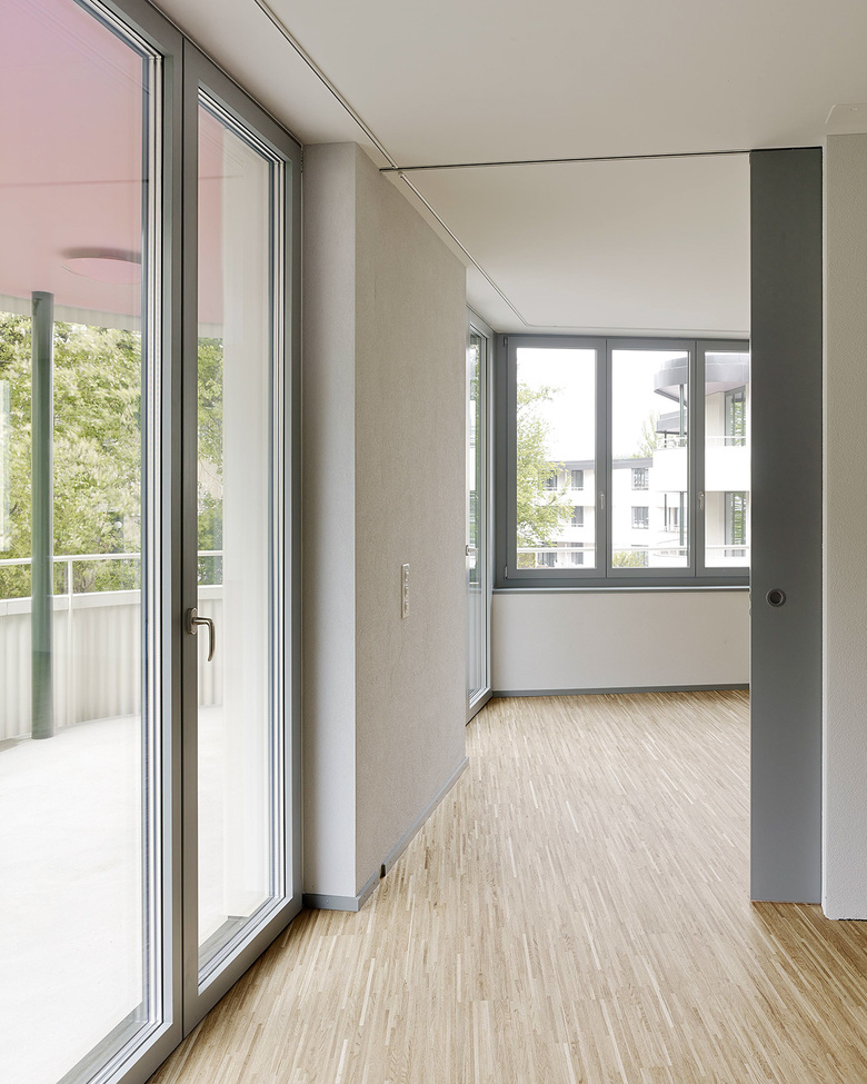 Aufgrund der Anordnung der Wohnungen sowie der Fassadenabwicklung verfügen die Wohnungen über zwei oder sogar drei Expositionen. Durch die räumliche Organisation der Wohnungen werden Korridore vermieden und grosse Wohnräume geschaffen. Die nicht orthogonalen Grundrissgeometrien erzeugen eine spannungsvolle, fliessende Räumlichkeit, welche durch die Zimmervolumen in einen Eingangs, Küchen- und Wohnbereich gegliedert wird.