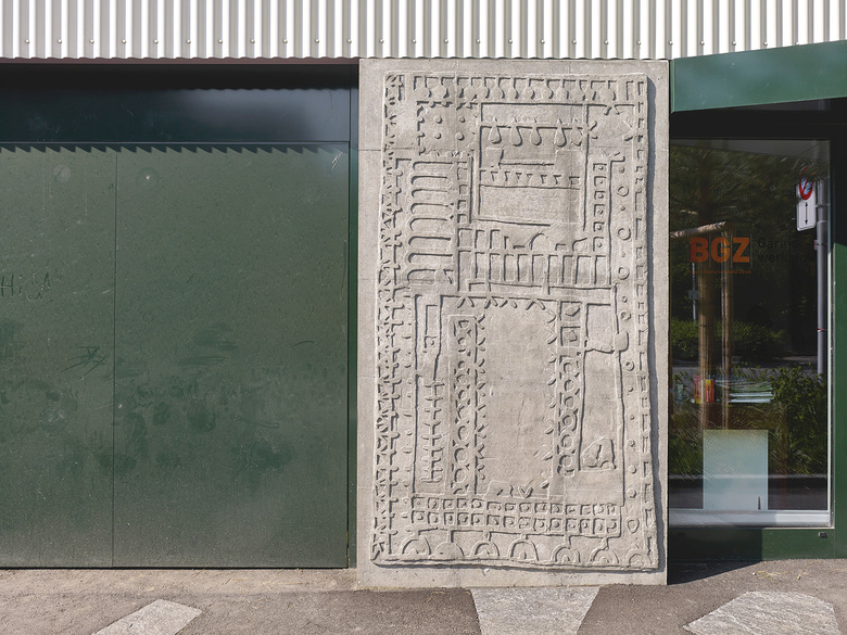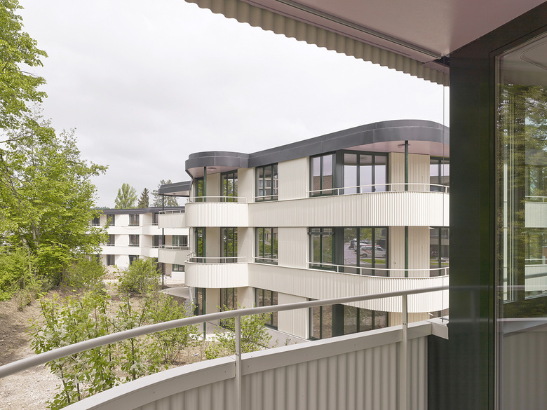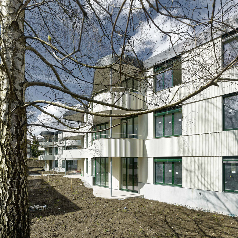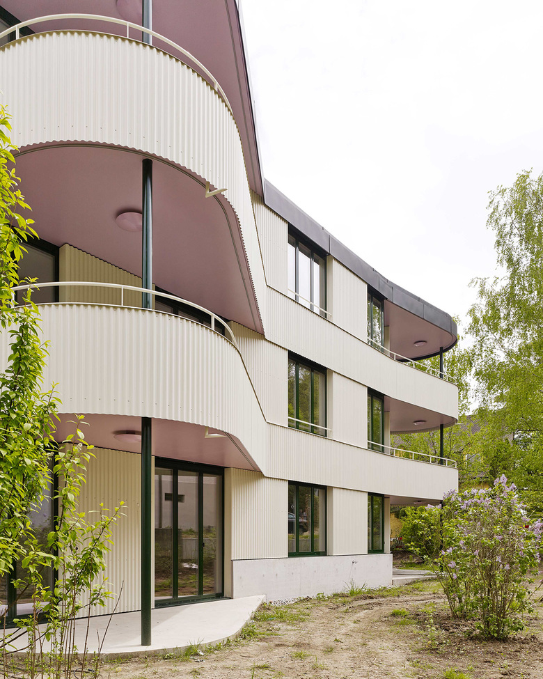 Die Häuser sind mit einer hinterlüfteten, in gebrochenem Weiss beschichteten Wellblechfassade bekleidet. Das Relief der Fassadenhaut erzeugt weiche Licht- und Schattenverläufe, die in ihrerin rerForm derrd.ungahrscheinlich nicht. Weichzeichnung in Beziehung zur umgebenden Vegetation treten. Die ausgreifenden Rundbalkone werden über die Brüstungsbänder ins Gebäudevolumen eingebunden. Im Erdgeschoss schaffen Bodenplatte und Sockel in Sichtbeton den Übergang vom Haus zum Garten. Drei Sockelreliefs des Künstlers Christian Hörler thematisieren die Darstellung des Paradiesgartens.