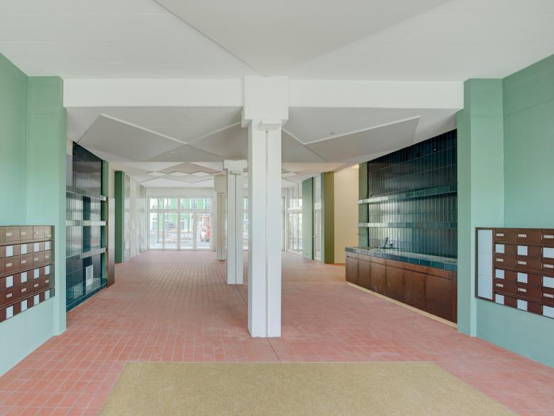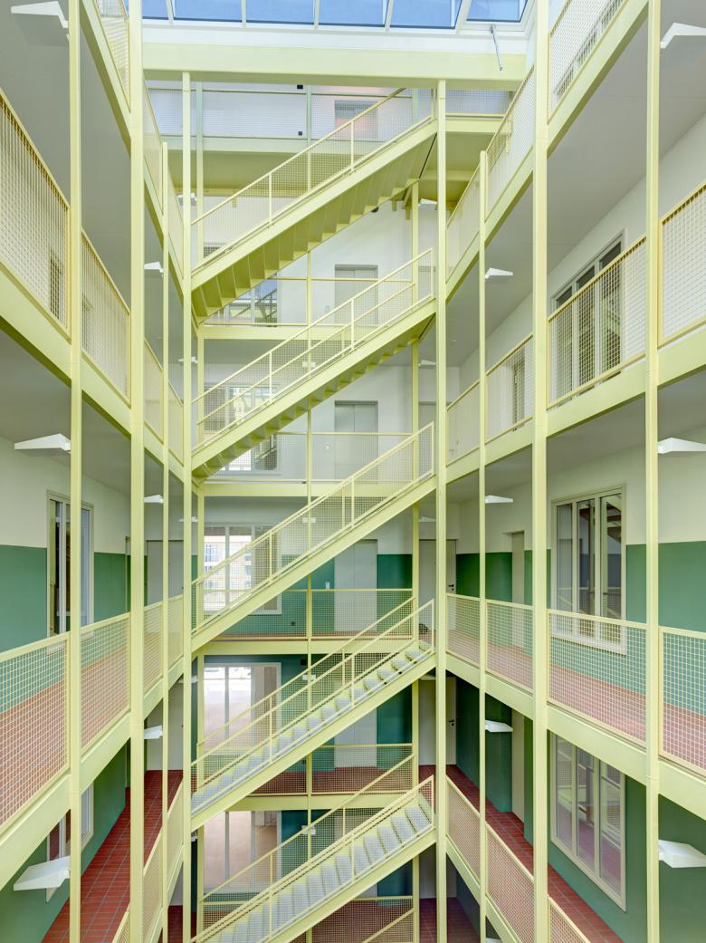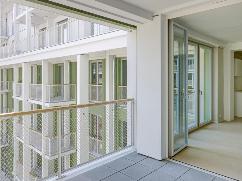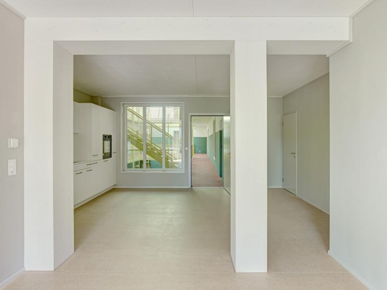 Die strukturelle Ordnung des hallenartigen Skelettbaus fasst die diversen Wohnungstypen zu einem Haus zusammen. Wohnungen mit zweiseitiger Ausrichtung und ein Holztragwerk, das als raumbildendes Element die tiefen Grundrisse rhythmisiert und gliedert, prägen das Raumgefüge. Vier grosse Atrien entspannen die hohe Dichte in den Gebäudeecken und führen mit ihren Glasdächern und grosszügig befensterten Innenfassaden die gassenartige, industriell geprägte Erschliessung im Gebäudeinneren fort.