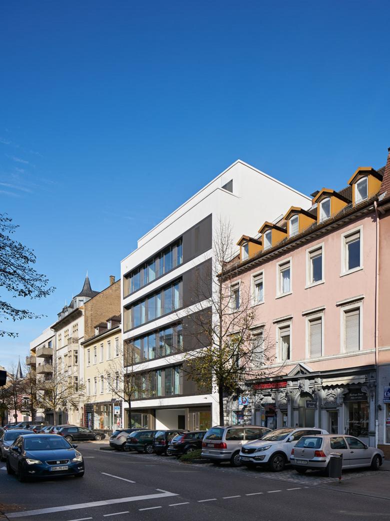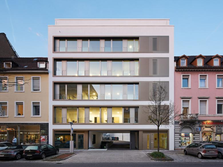 Ein Bürogebäude aus den sechziger Jahren des vorigen Jahrhunderts sollte baulich wie energetisch saniert und auf modernsten Bürostandard gebracht werden. Gelegen inmitten eines der schönsten Altbau-Ensembles Karlsruhes, war es unser Ziel, das Gebäude durch eine maßstäbliche und zugleich klassische Gliederung in Sockel, Prospekt und Attikabesser in den Altbestand einzufügen, ohne seine Modernität zu leugnen. Die bauzeittypische Bandfensterfassade wurde beibehalten, aber mit überdimensionalen Einfassungen den Sandsteingewänden der Nachbarhäuser angeglichen. Wie Schaukästen sitzen die Ausschnitte in der Fassade und zitieren damit ein bekanntes Motiv der ortstypischen Bebauung. Eine hochwertige Materialität aus Glas, bronziertem Aluminium und weißem Putz zoniert den „Klotz" ebenfalls hinunter und nimmt den Kanon der Blockrandbebauung auf, ohne sich anzubiedern.