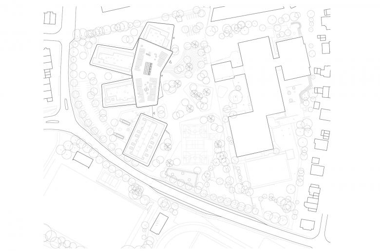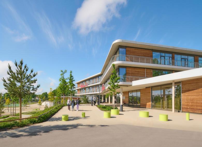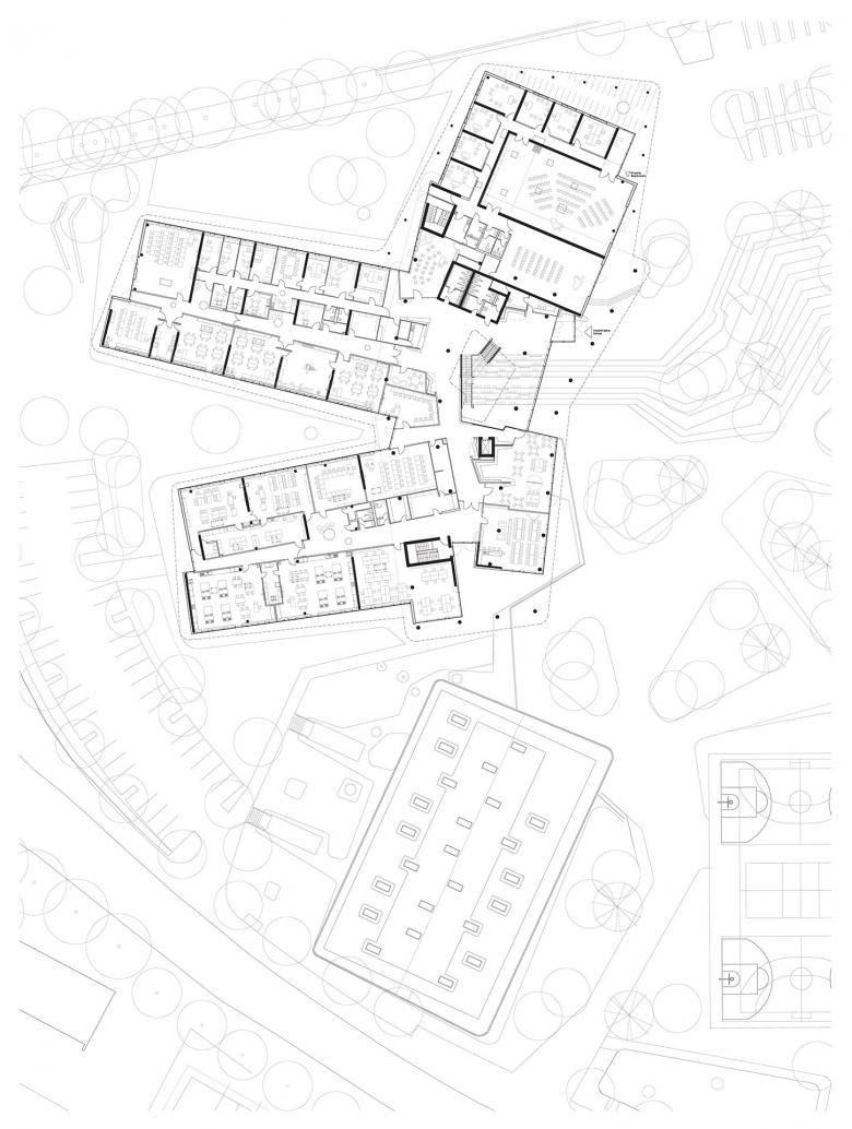 The main aim of the architectural concept was to create a space that would cater to potential developments in education in the coming years. It was important for the structure to be flexible enough to allow a curriculum to be delivered during a phase of didactic transition. The design is intended to promote a strong sense of identity, while integrating smoothly into the existing school campus. A schoolyard located in the center of the campus is shared with the adjacent grammar school, the Paul Klee Gymnasium. The spacious area offers the students of both schools room for lunchtime or afternoon activities. The site’s topography was used to maintain the north-south axis passing across the traffic-free school area and made it possible for this axis to be redesigned in a way that would be disability friendly.